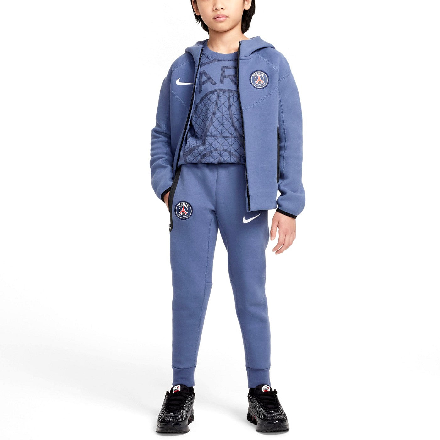 This stunning set features denim blue Tech Fleece zull fip hoodie and matching pants, both with the PSG crest and Nike swoosh. Perfect for your kid's training sessions or leisure time, this set will show the french pride everywhere!