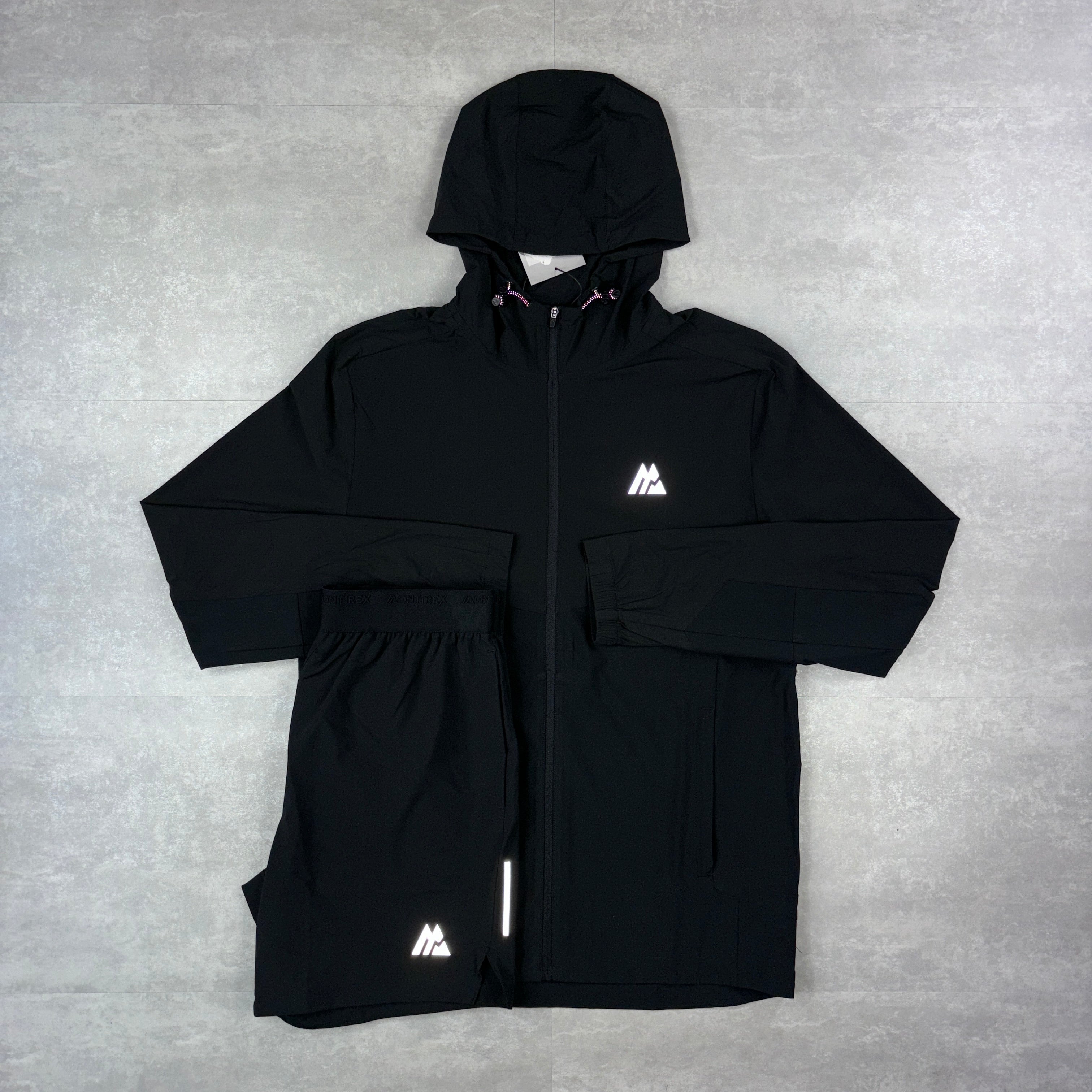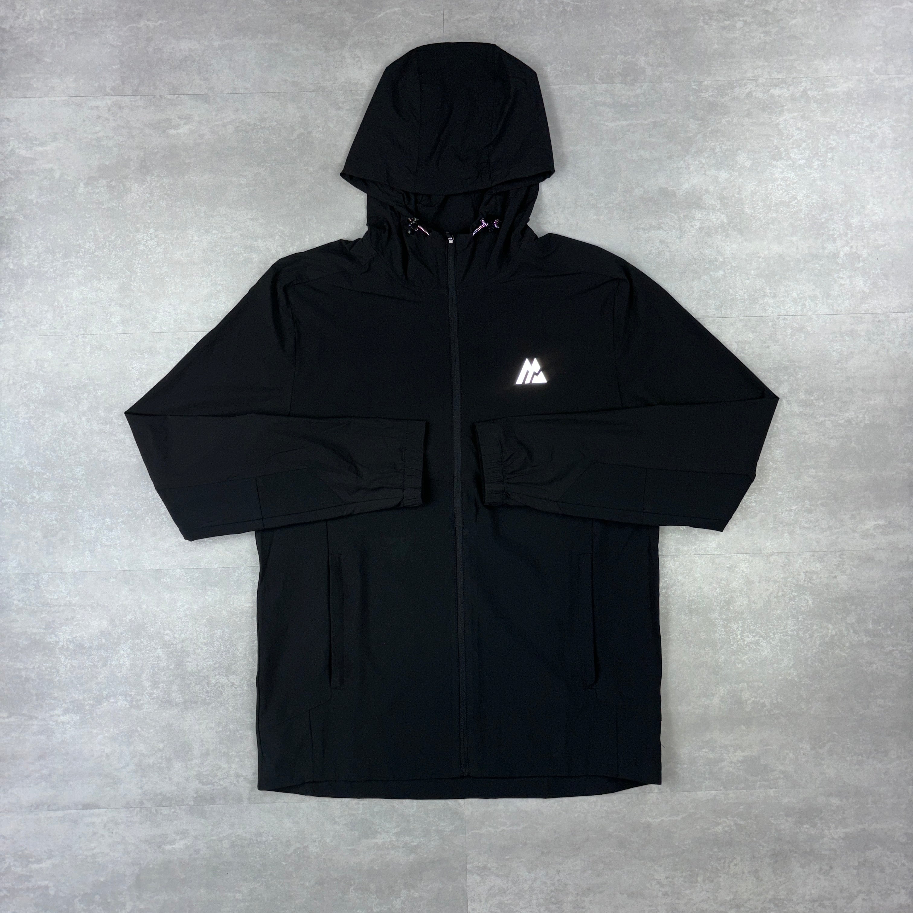 The Surge Jacket in Black offers a standard fit for comfortable wear and features reflective detailing for increased visibility. Its lightweight ripstop fabrication and bonded back vent panel provide superior breathability. The contrast lightweight sweatwicking woven fabrication and adjustable hood offer added convenience and practicality.