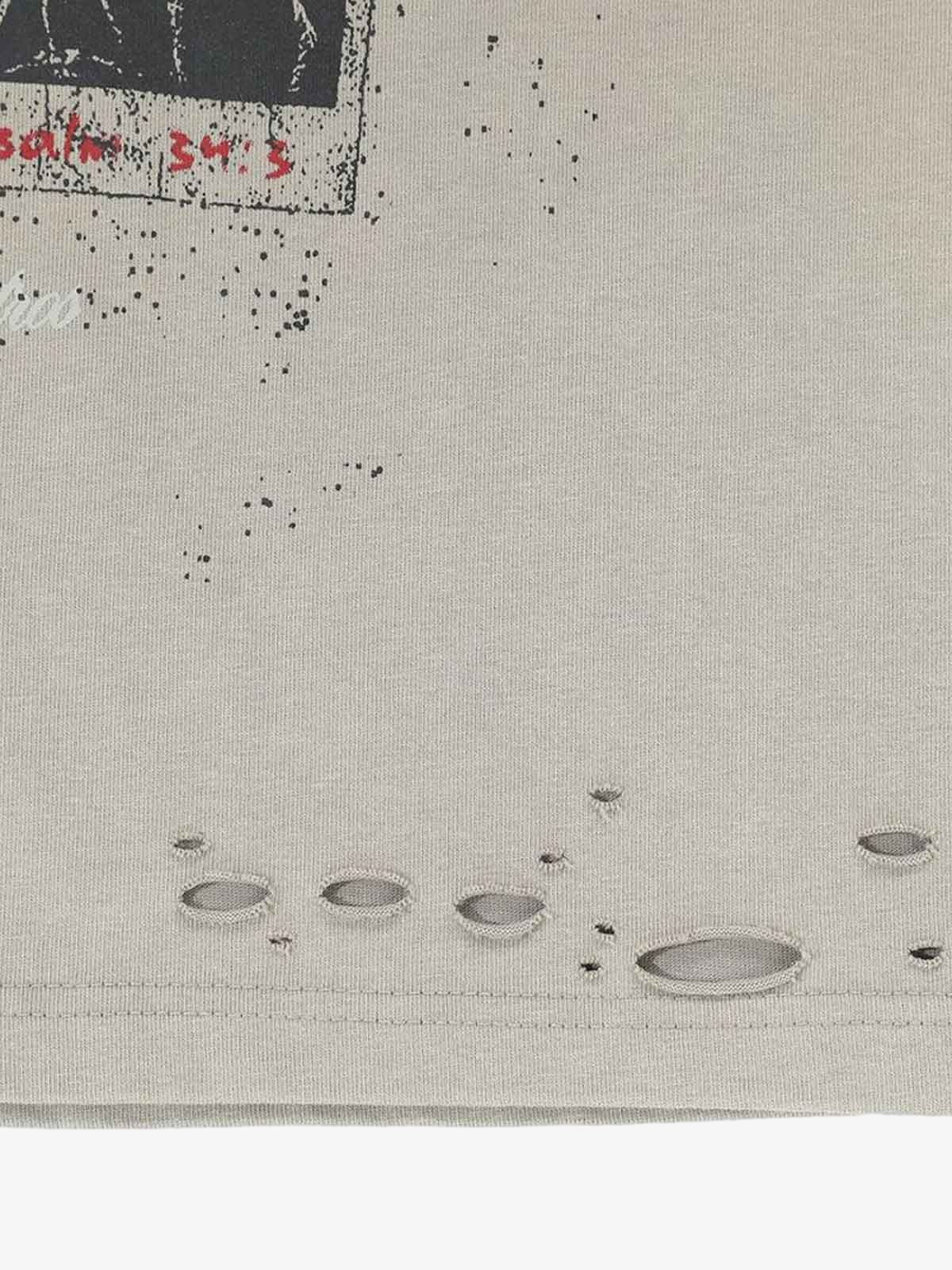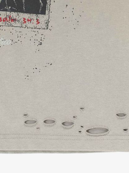 • Detail Features: Distressed holes along the hemline, graphic print on the chest, splatter paint effect