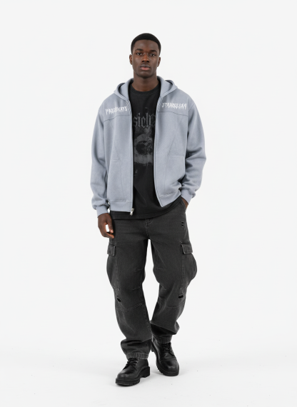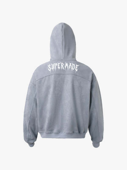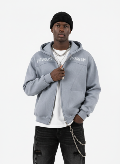• Design Elements: Distinctive typography on sleeves, front zipper closure, hooded design