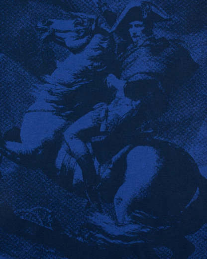 A tribute to French legacy — this piece reimagines the nation’s most iconic painting, Napoleon Crossing the Alps, woven into deep navy cotton. Tricolour stripes descend from the shoulders, while the chest is embroidered with the French football crest.