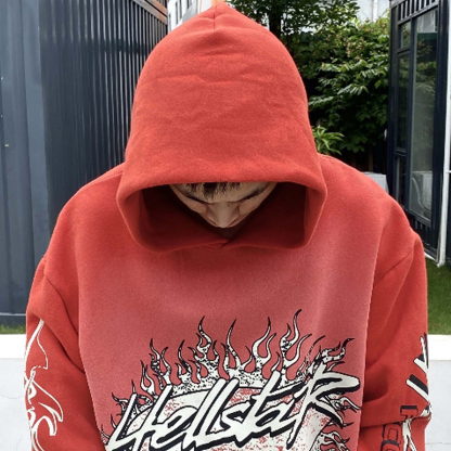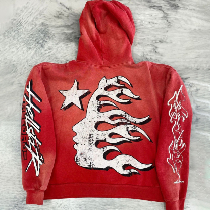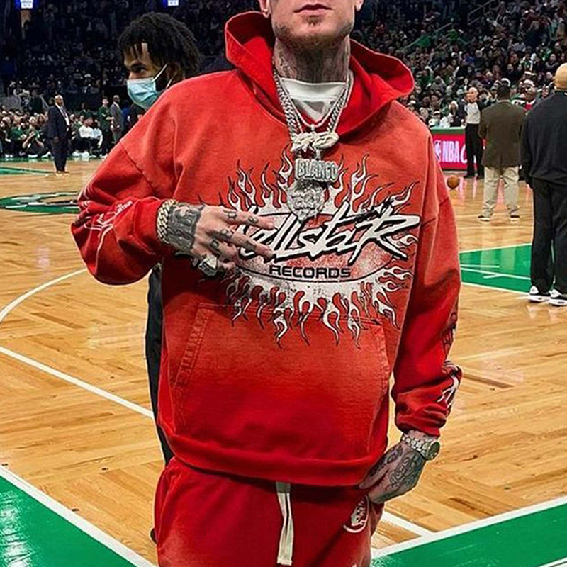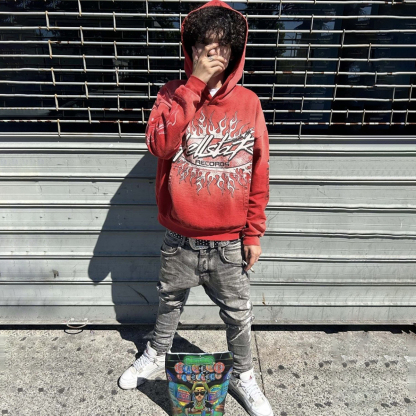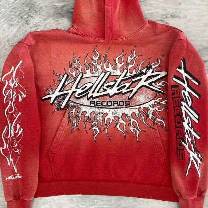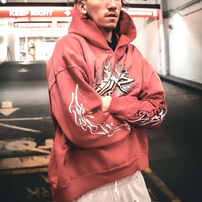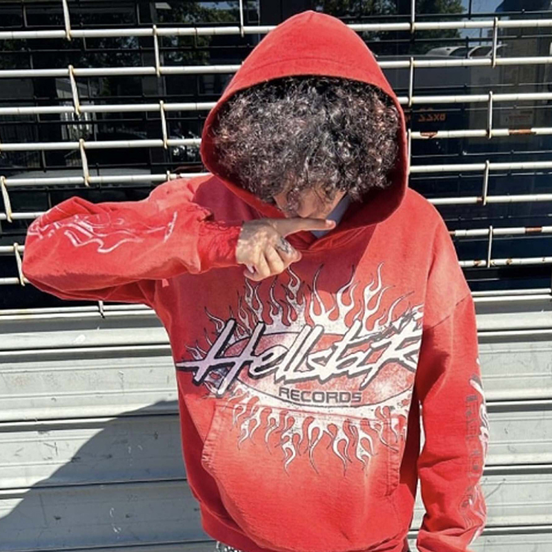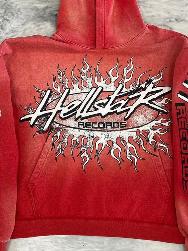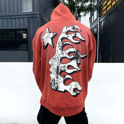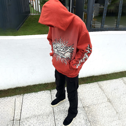 Red Vintage Pullover Hip-Hop Washed Casual Long Sleeve Fleece-lined Hoodie