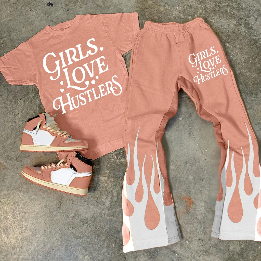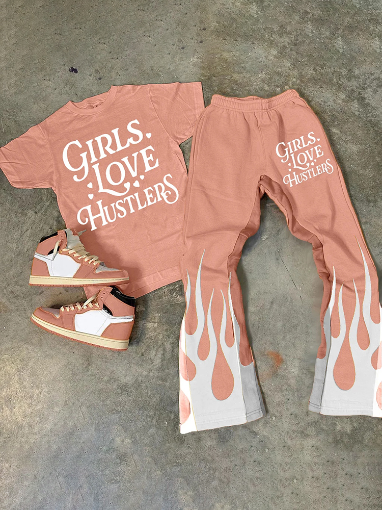 Personalized Girl Loves Hustlers Print Graphic Short Sleeve Tee & Flared Trousers Two Piece Set