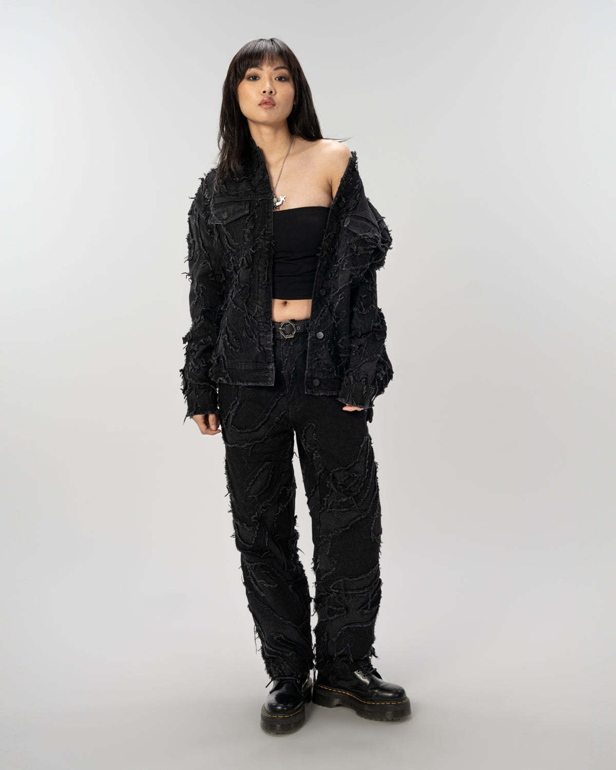 - Distressed patchwork denim pants