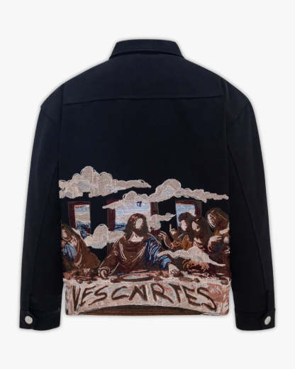 Black Canvas Jacket with the lower front and back panels adorned with over 2 million stitches, forming a reimagined version of Da Vinci’s Last Supper in muted, pale tones. Finished with a metal zipper and custom Vescartes hardware, it blends historical art with modern streetwear structure.