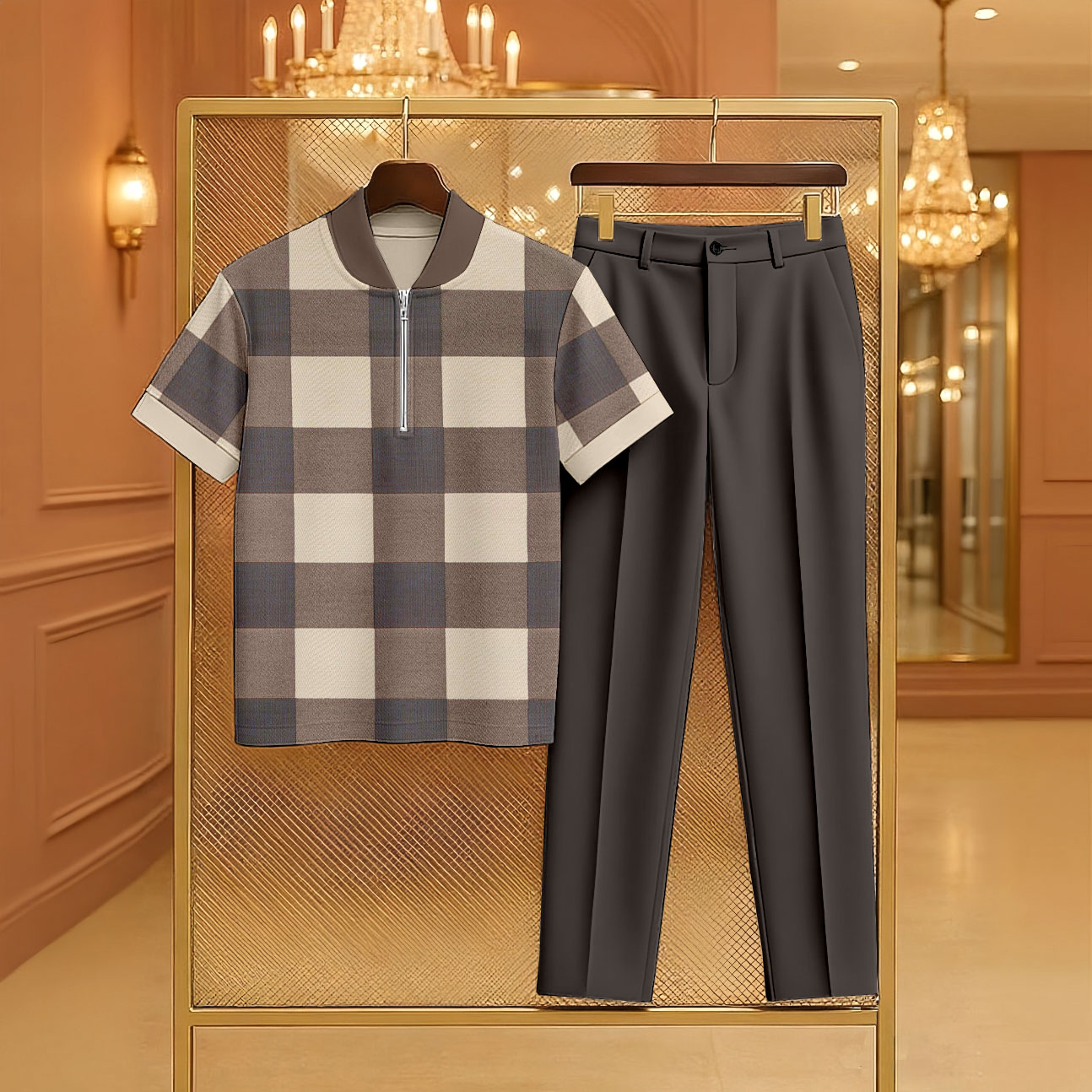 Men's Casual Coffee Color Matching Checkered Printed Zipper Short Sleeved Polo Shirt & Trousers Two-Piece Set