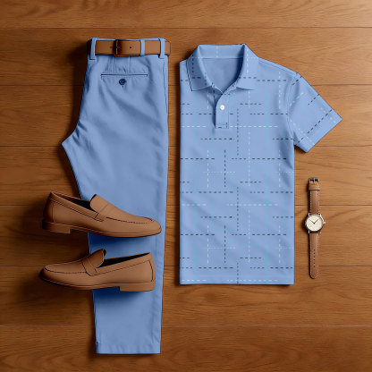 Men's Casual Blue Color Matching Checkered Printed Short Sleeved Polo Shirt & Trousers Two-Piece Set