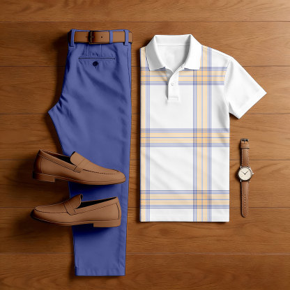 Men's Casual Violet & WhiteColor Matching Checkered Printed Short Sleeved Polo Shirt & Trousers Two-Piece Set