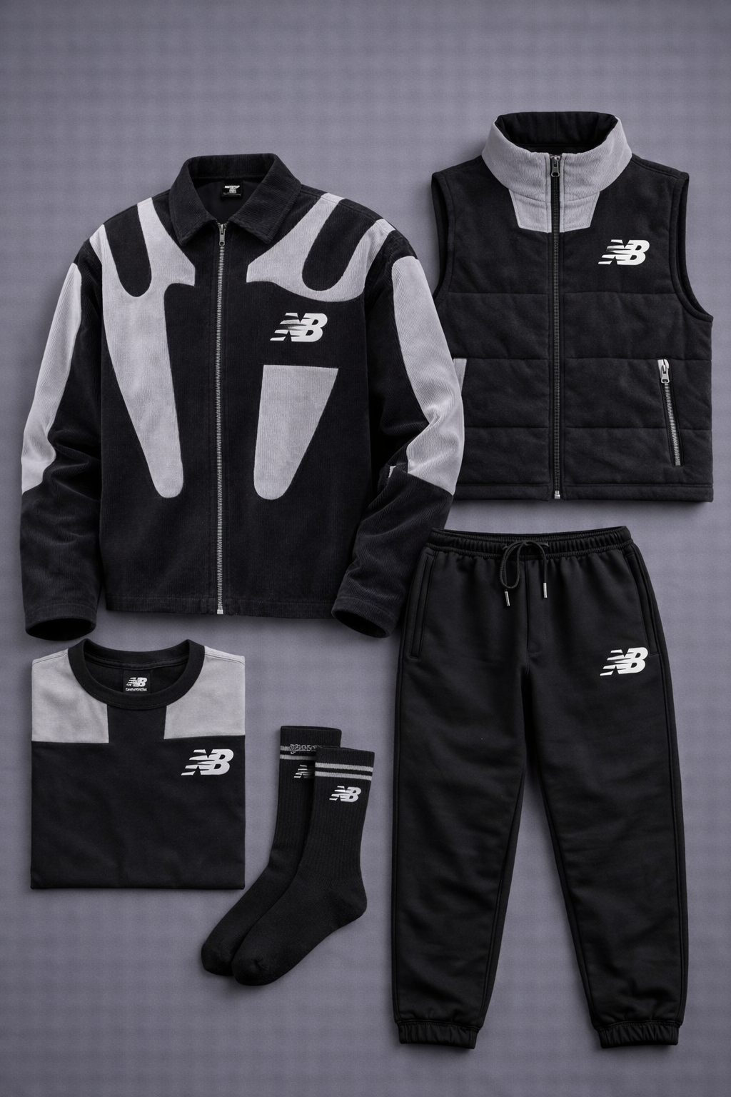 The set includes a zip-up jacket, a sleeveless vest, a T-shirt, athletic pants, and socks, all featuring the iconic New Balance logo and a minimalist design that highlights the contrast between colors. The materials are designed to ensure comfort, breathability, and freedom of movement, making this outfit ideal for everyday wear.