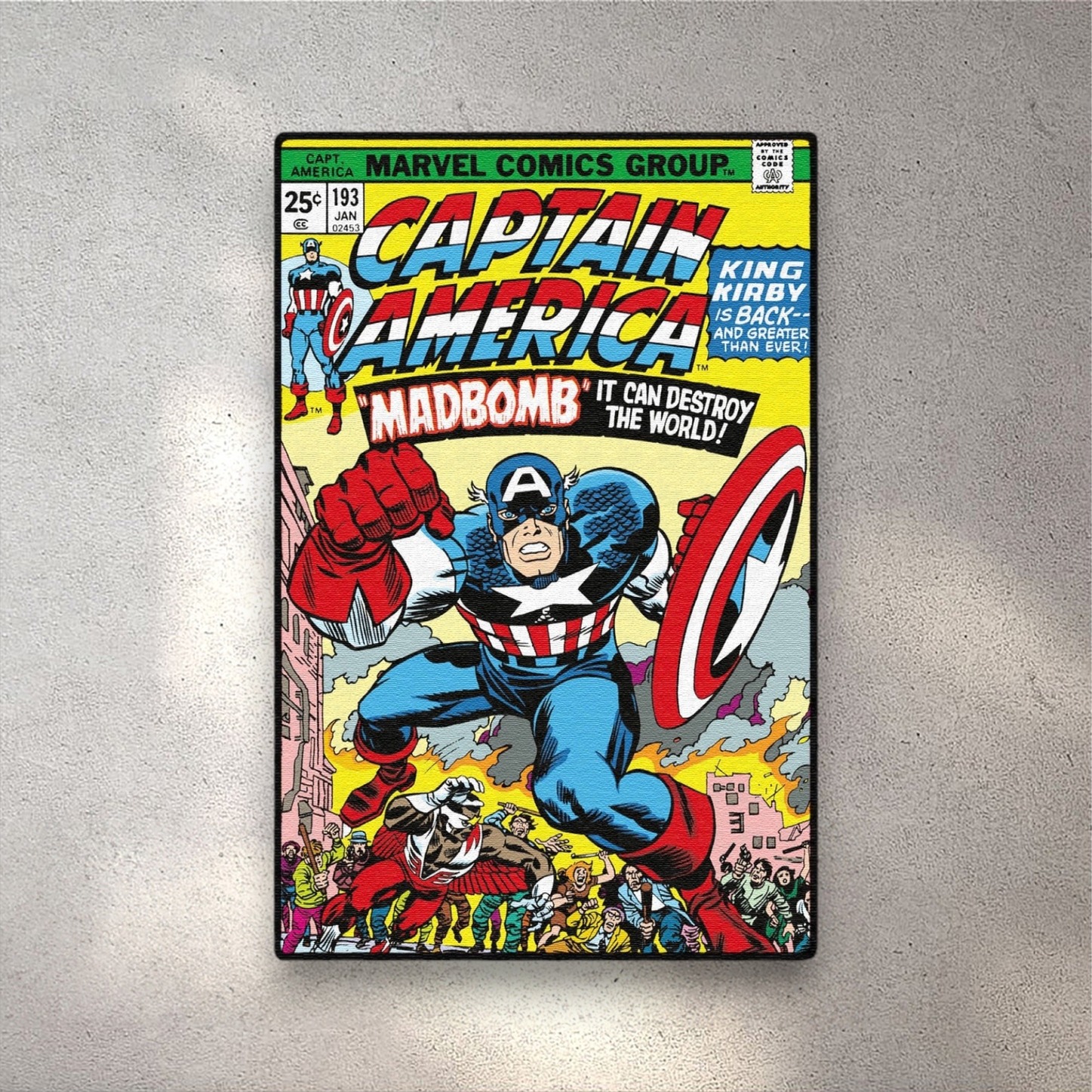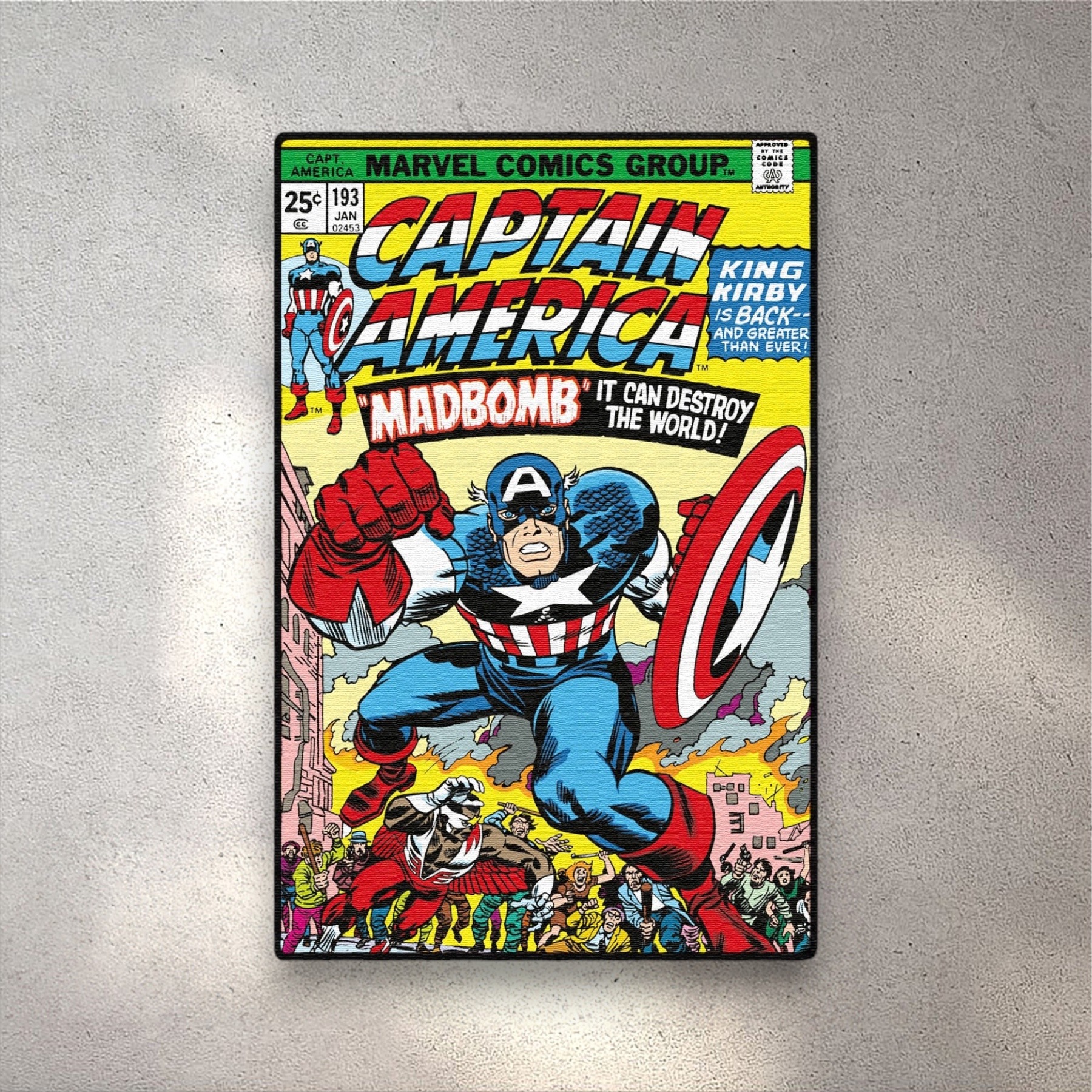 This rug features the iconic cover of Captain America #193 (1976), where the hero battles the destructive Madbomb. With vibrant colors and action-packed artwork by Jack Kirby, this piece celebrates a pivotal moment in Captain America’s history as he fights to save the world from chaos. A must-have for any Marvel fan.