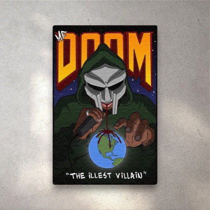 This rug features an original design of MF DOOM, the masked hip-hop legend, depicted as the “Illest Villain” controlling the world. With its bold colors and striking imagery, this piece captures the larger-than-life persona of MF DOOM and his influence on underground hip-hop. Perfect for any fan of the iconic rapper.
