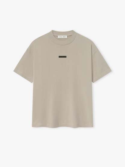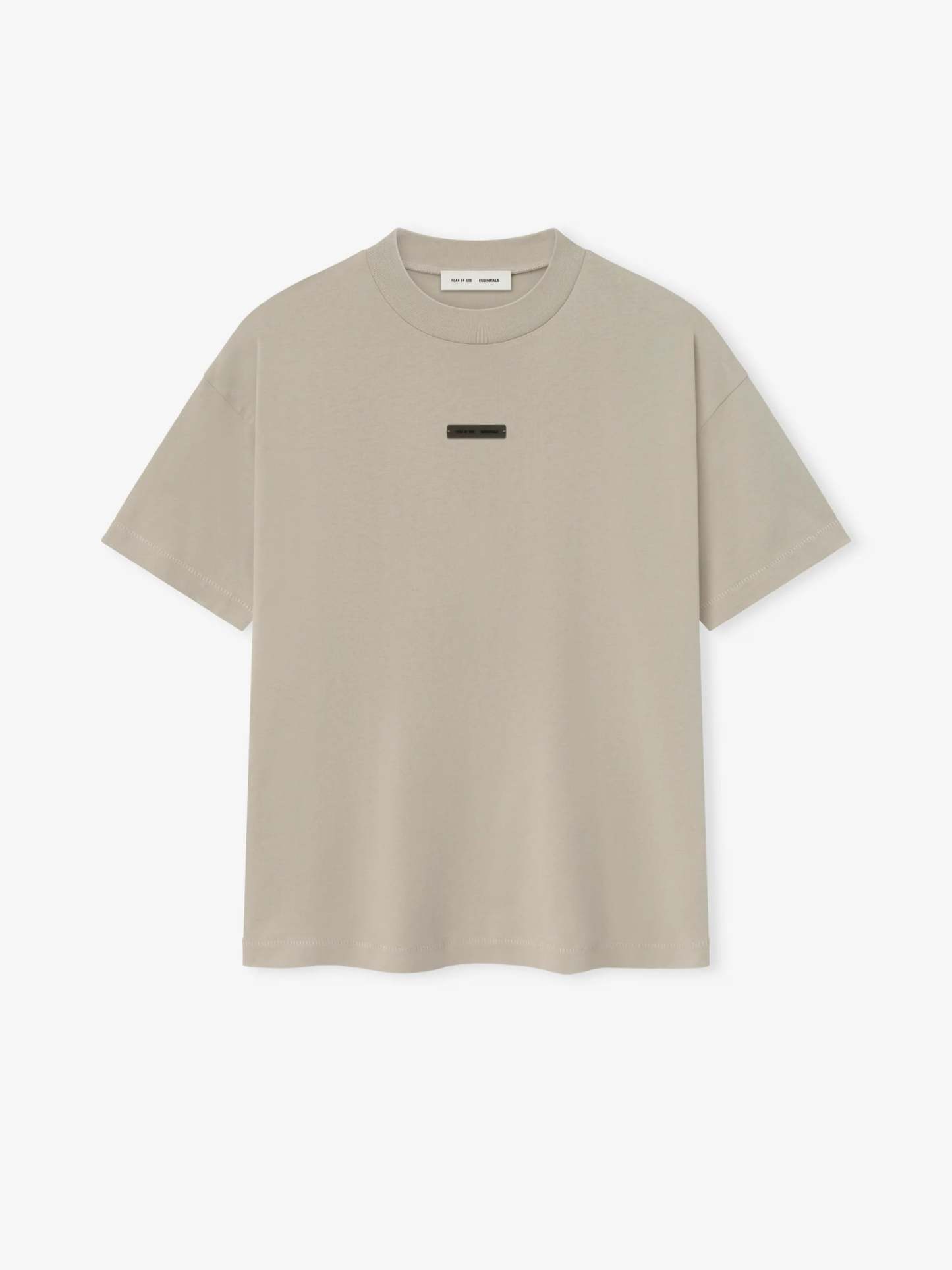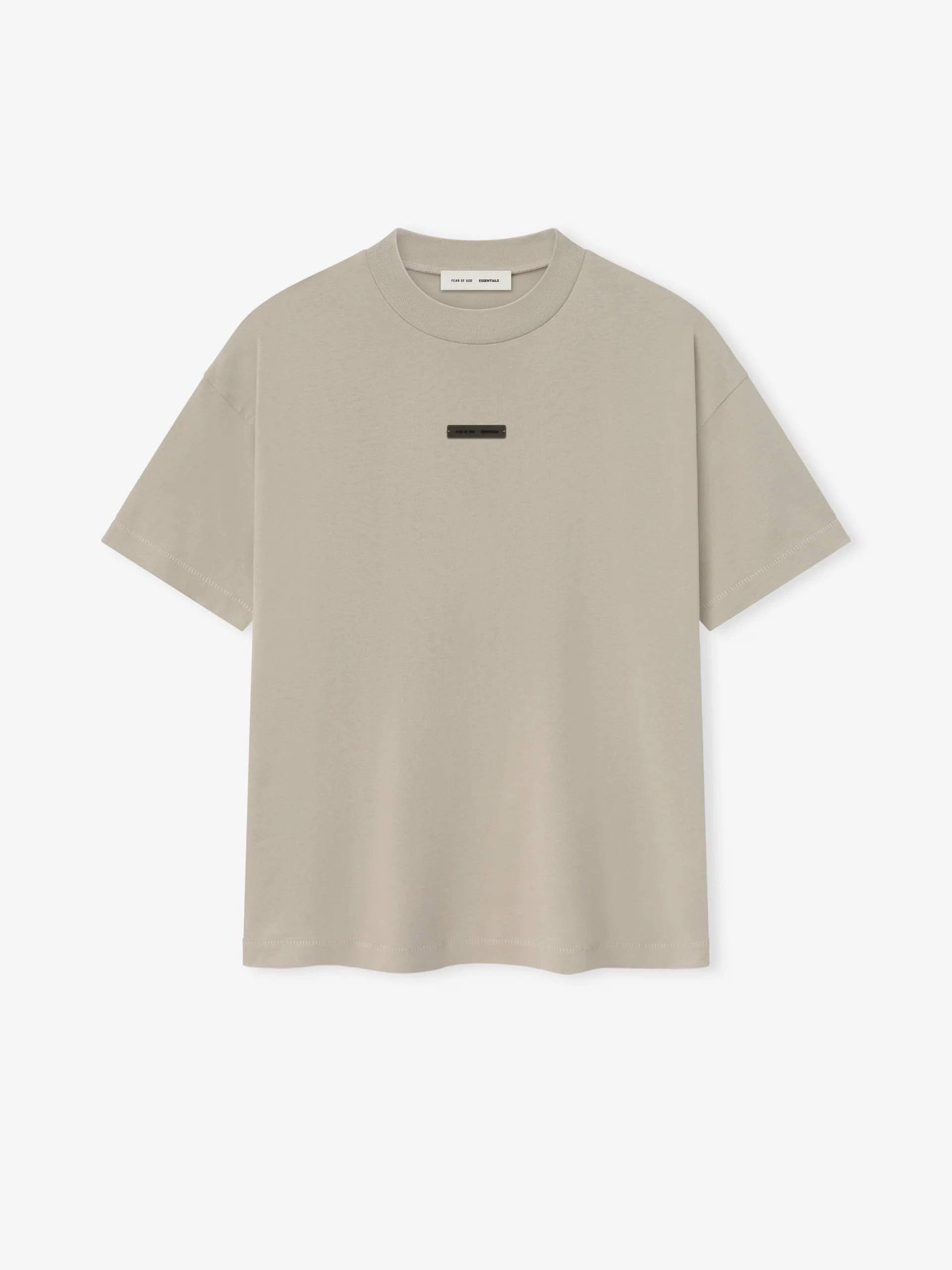 The Classic Tee is made from medium-weight 100% cotton jersey. The rib-knit crewneck tee features a classic fit with signature Fear of God relaxed proportions for everyday wear. Branding includes a "Fear of God Essentials" translucent rubberized label at the center front and a new "Essentials Fear of God" beveled metallic logo across the back.
