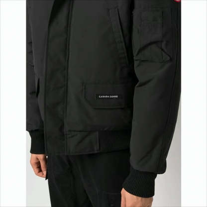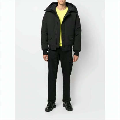 This Canada Goose padded jacket is designed for unparalleled warmth with an insulated filling of 80% duck down and 20% duck feather. Its matte black outer shell features a functional hood, ribbed cuffs, and hem, ensuring a snug fit against the elements. With a hidden front zip closure and multiple pockets for storage, it blends practicality and style effortlessly. The slightly boxy silhouette embodies a contemporary aesthetic, making it an essential layering piece for modern excursions.