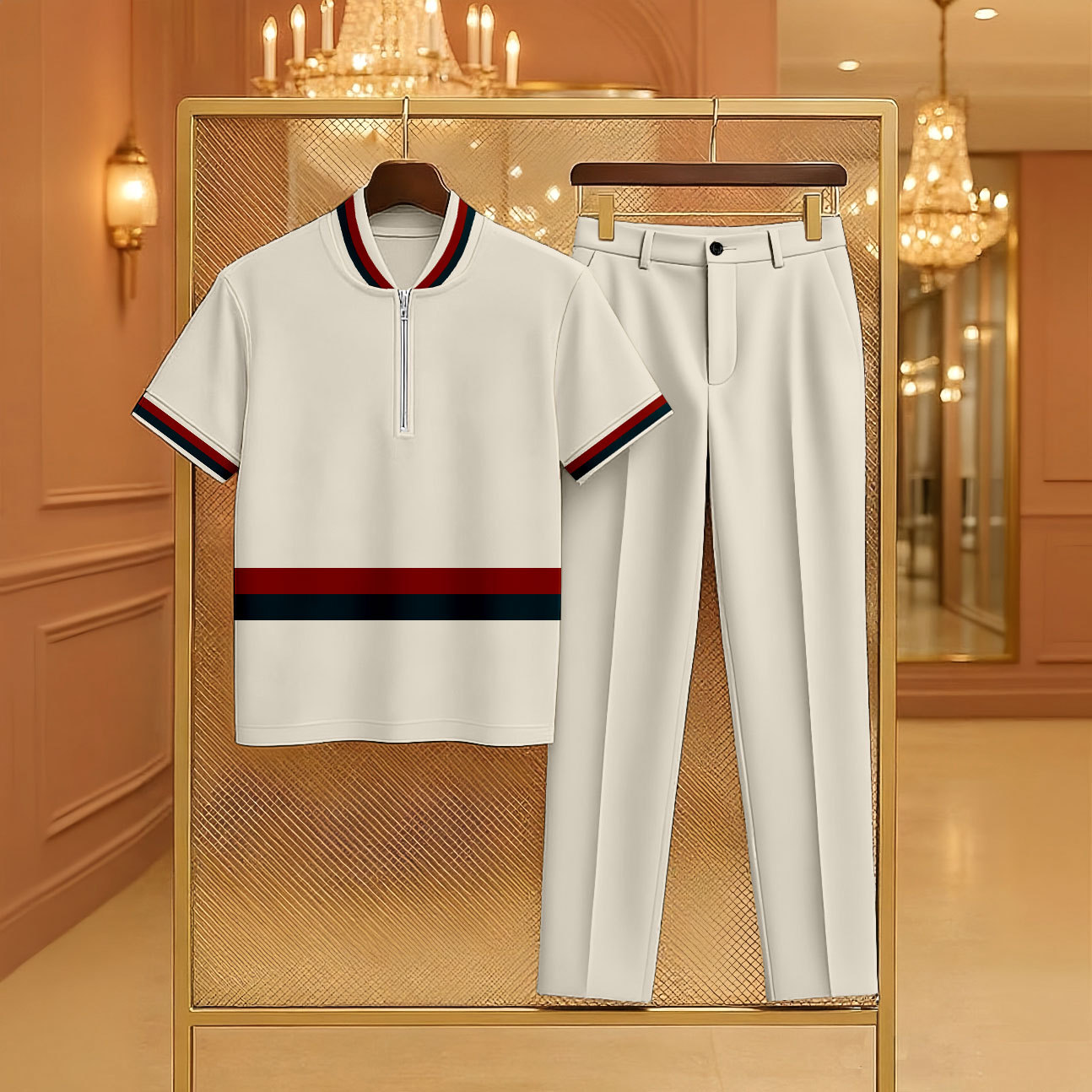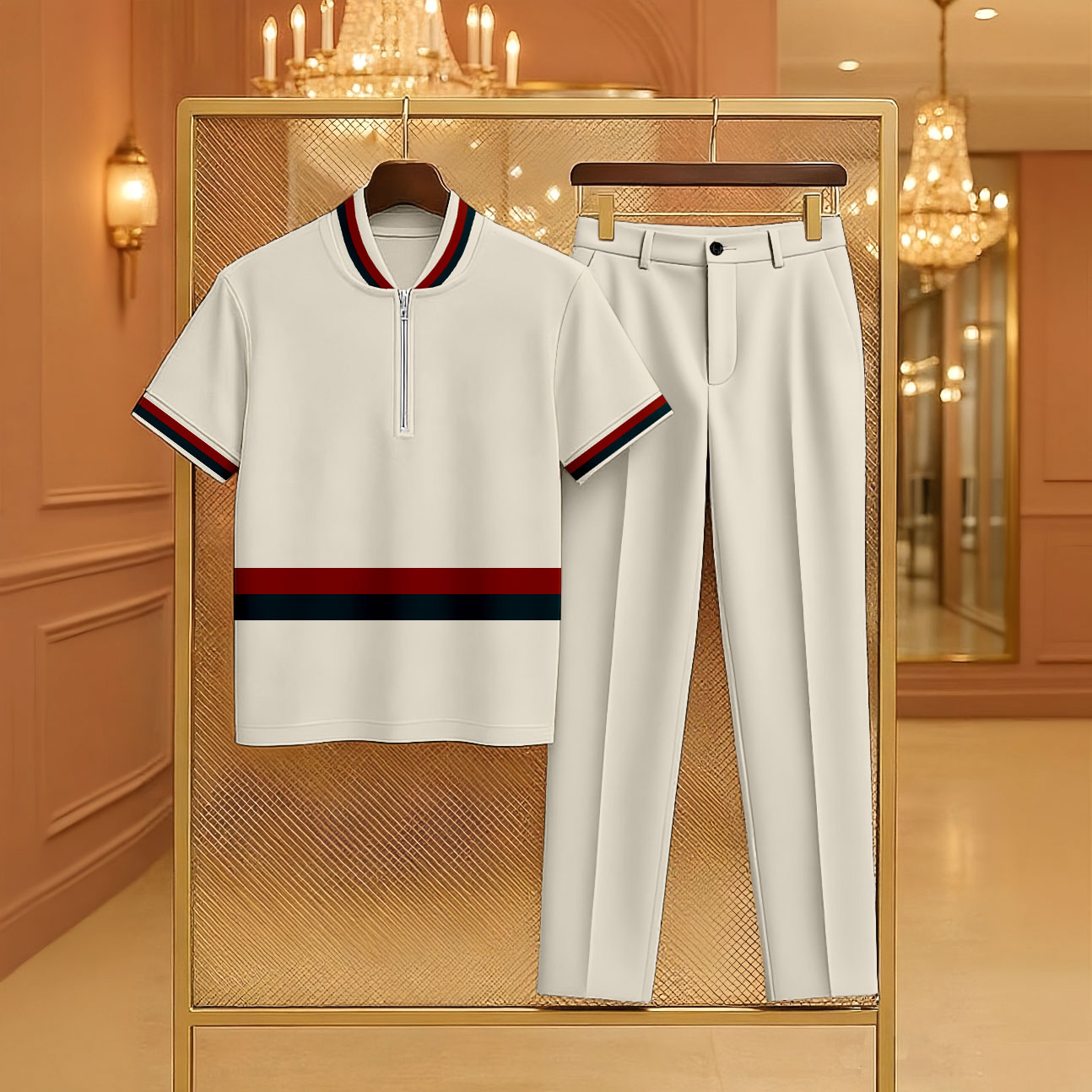 Men's Casual Black & Red Color Matching Striped Printed Zipper Short Sleeved Polo Shirt & Trousers Khaki Two-Piece Set