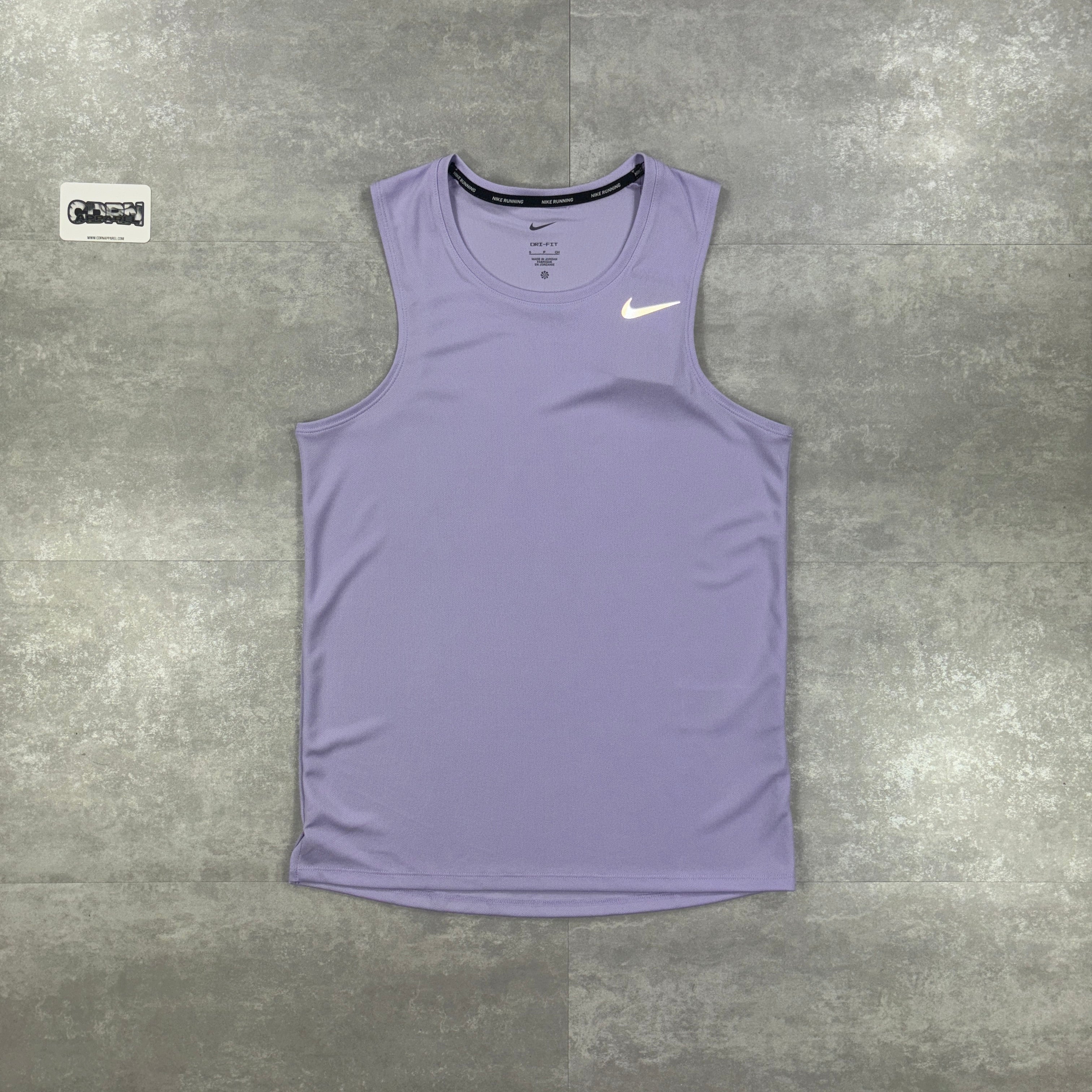 Step up your wardrobe in this men's Miler Vest from Nike. In a Lavender colourway, this standard-fit tee is made from breathable poly fabric with Dri-FIT tech to keep away sweat and keep you cool. It features a crew neckline, short sleeves and reflective details to keep you seen after dark. With a dropped hem for extra coverage. this running vvest is finished with the signature Swoosh logo to the chest. Machine washable.