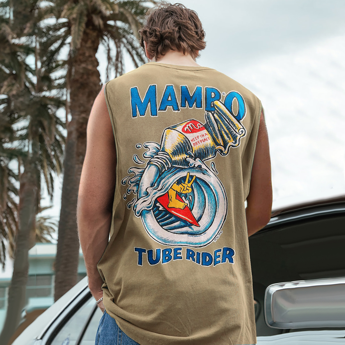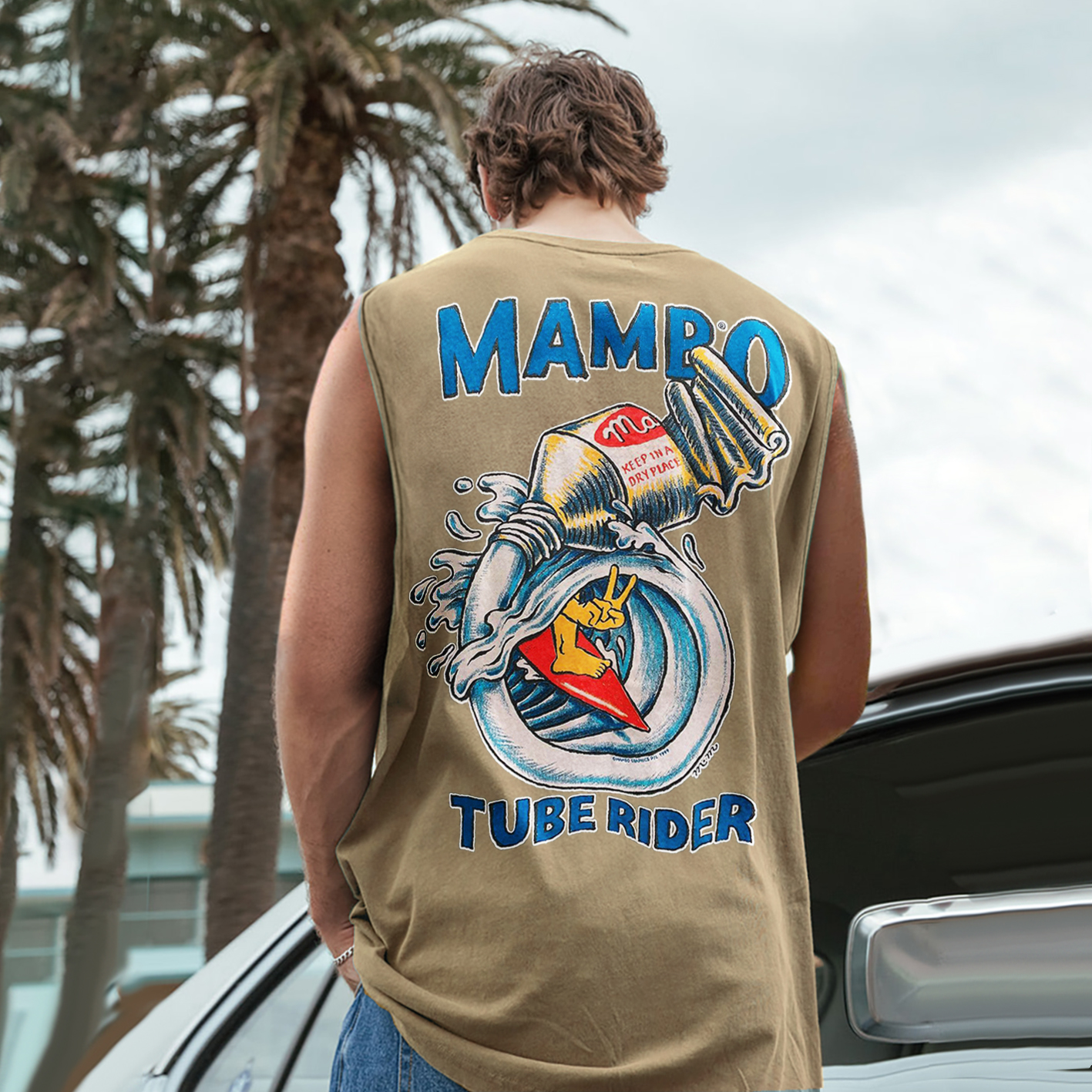 Vintage Unisex Oversized Sleeveless T-shirt Seaside Holiday Surfing Print Vest