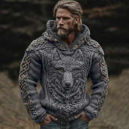 Men's Viking Wolf Celtic Knot Jacquard Knitted Hooded Sweater