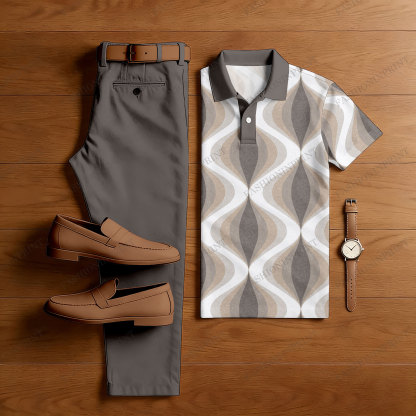 Men's Casual Color Matching Diamond Pattern Short Sleeved Polo Shirt & Trousers Two-Piece Set
