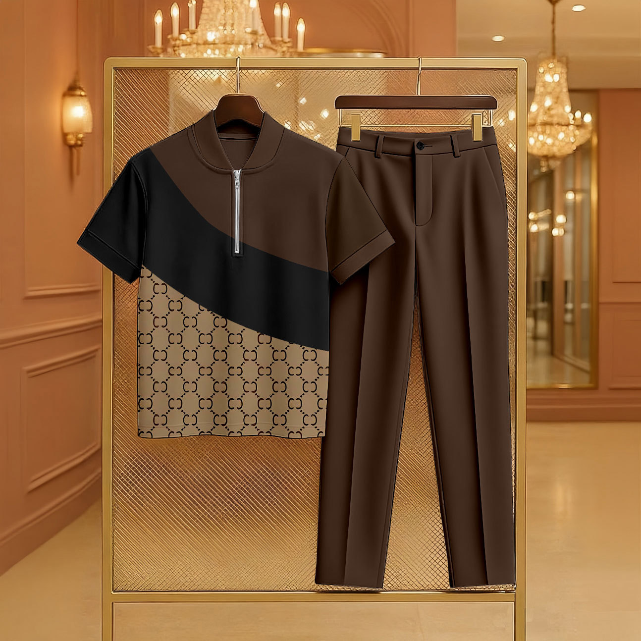 Men's Casual Coffee & Khaki Color Matching Vintage Asymmetric Printed Zipper Short Sleeved Polo Shirt & Trousers Two-Piece Set