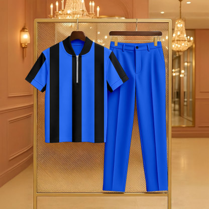 Men's Casual Royal Blue Color Matching Striped Printed Zipper Short Sleeved Polo Shirt & Trousers Two-Piece Set