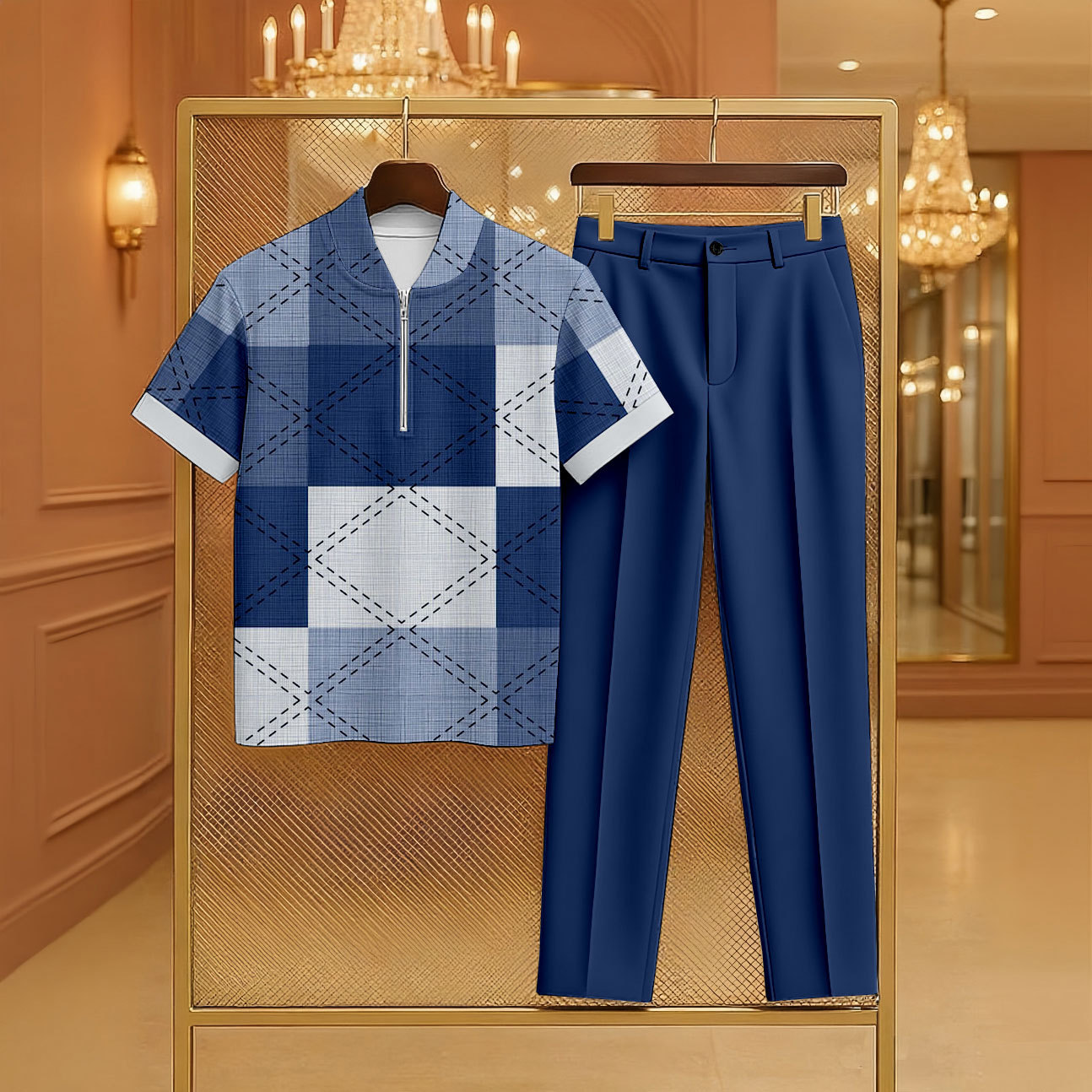 Men's Casual Denim Blue Color Matching Checkered Printed Zipper Short Sleeved Polo Shirt & Trousers Two-Piece Set