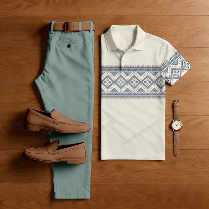 Men's Casual Color Matching Wave Printed Short Sleeved Polo Shirt & Trousers Two-Piece Set