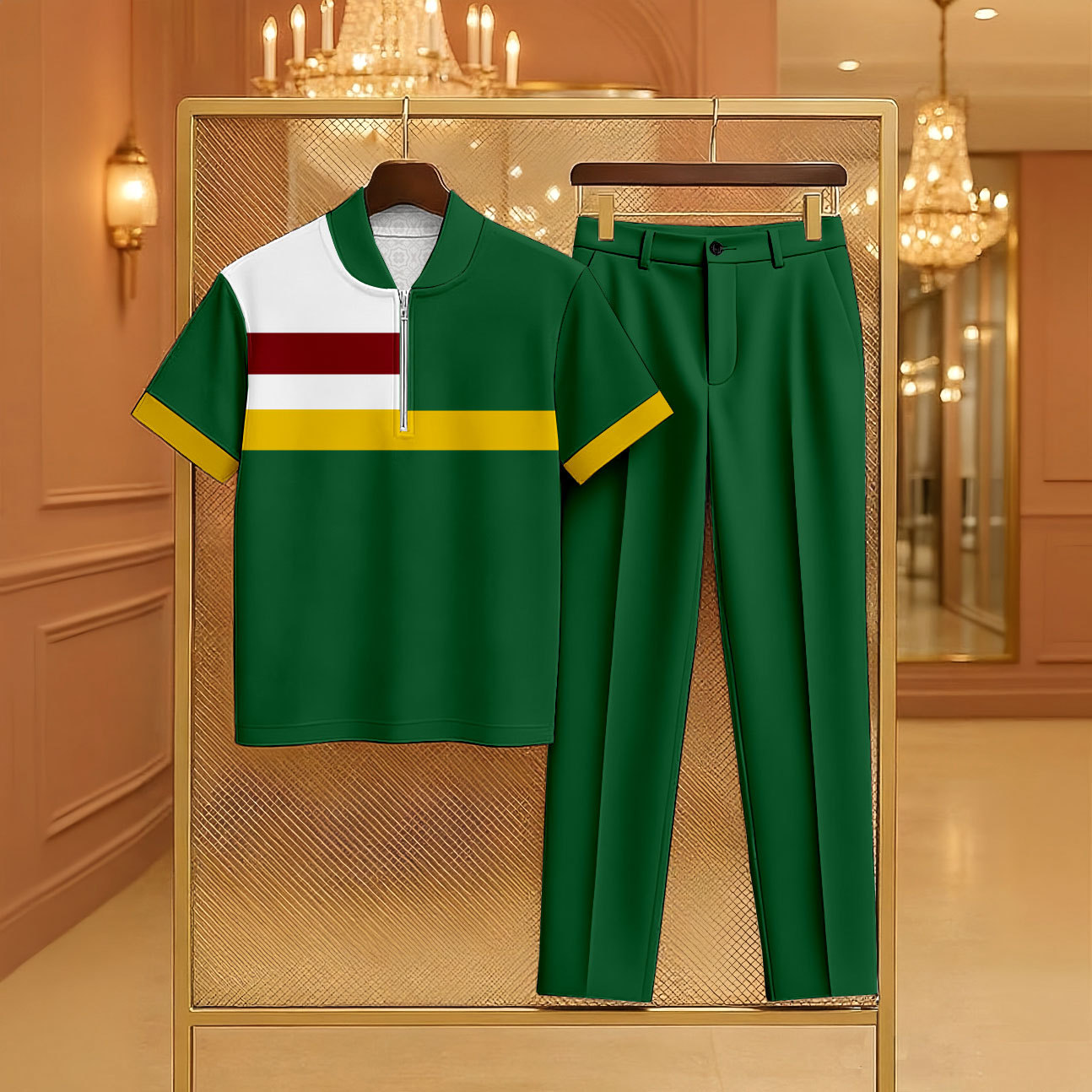 Men's Casual Green & Yellow Color Matching Geometric Printed Zipper Short Sleeved Polo Shirt & Trousers Two-Piece Set