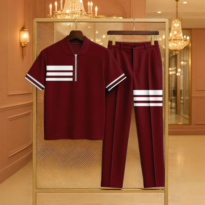 Men's Casual Maroon Color Matching Striped Printed Zipper Short Sleeved Polo Shirt & Trousers Two-Piece Set