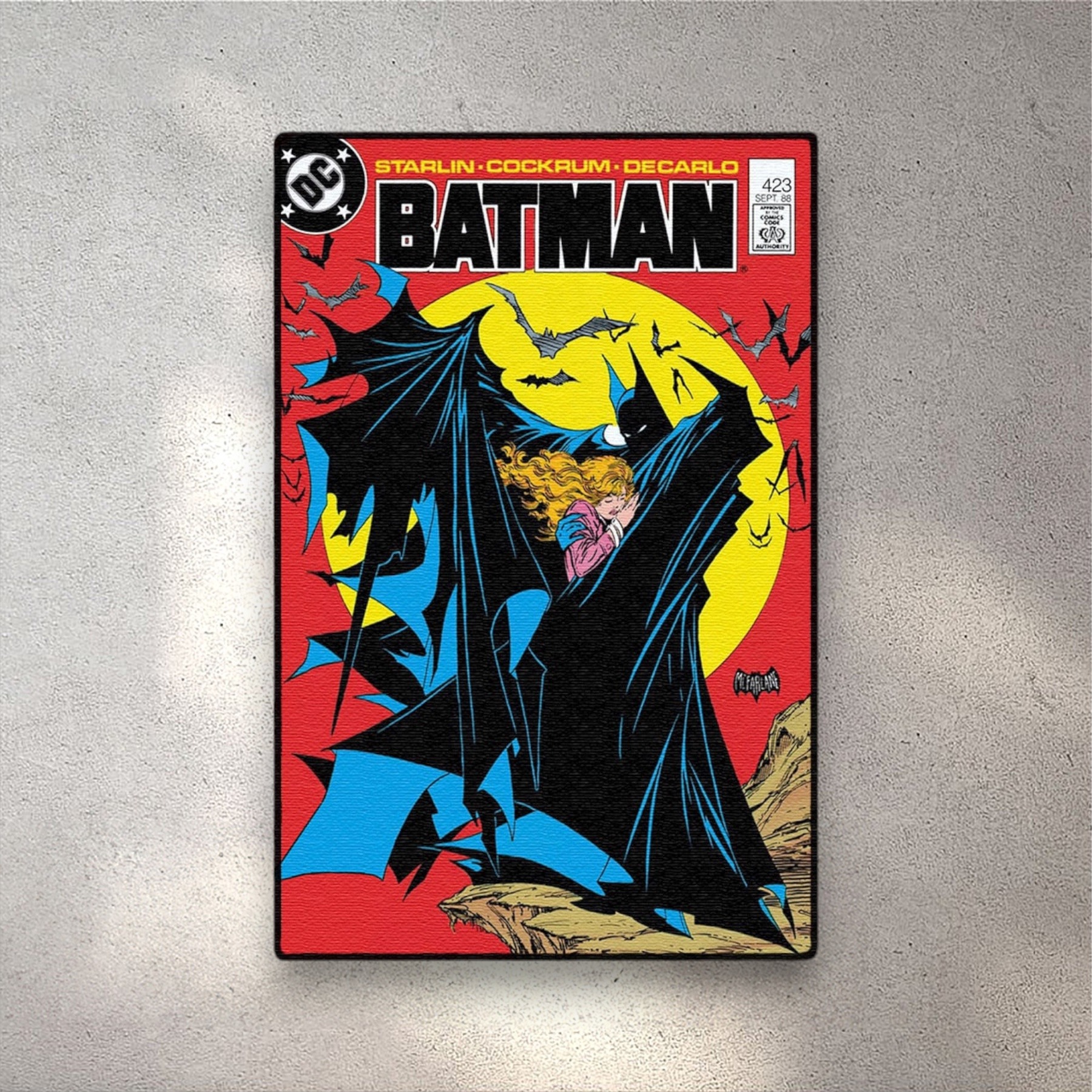 This rug features the iconic cover of Batman #423 (1988), with artwork by the legendary Todd McFarlane. The striking image shows Batman silhouetted against a full moon, dramatically shielding a woman in his cape, showcasing the Dark Knight’s protector persona. A powerful addition to any Batman fan’s collection.
