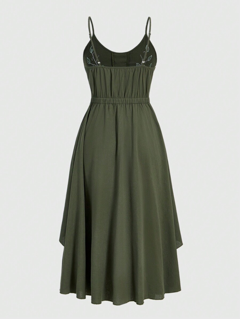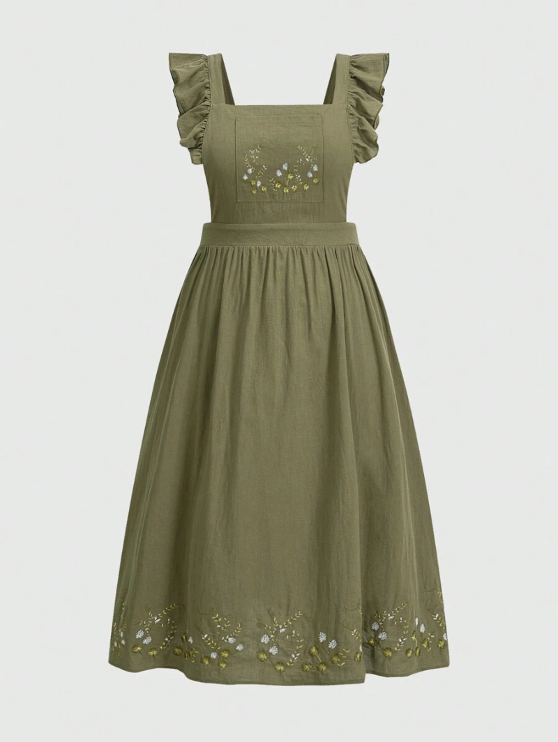 Fairycore Women's Plus Size Green Style Long Dress With Suspender, Tiered Ruffle And Floral Embroidery