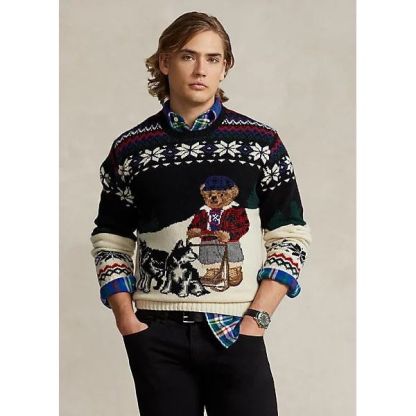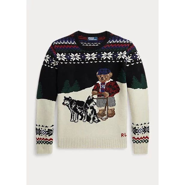 This chunky-knit jumper features the iconic Polo Bear ready for a ride through the snow with a sled and two dogs. On the left hem, it is hand-embroidered with our founder's initials.
