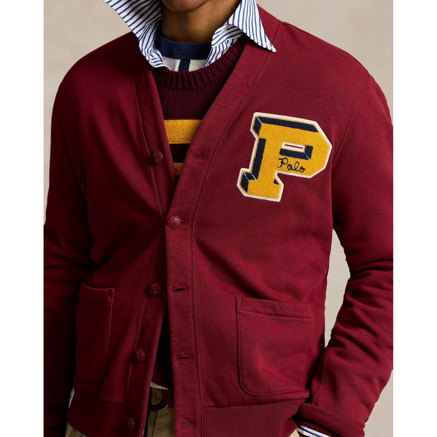 This cotton-blend layer combines the polished silhouette of a cardigan with the comfort of a sweatshirt. Stripes on the sleeve and a letterman-style "P" patch add a varsity-inspired twist.