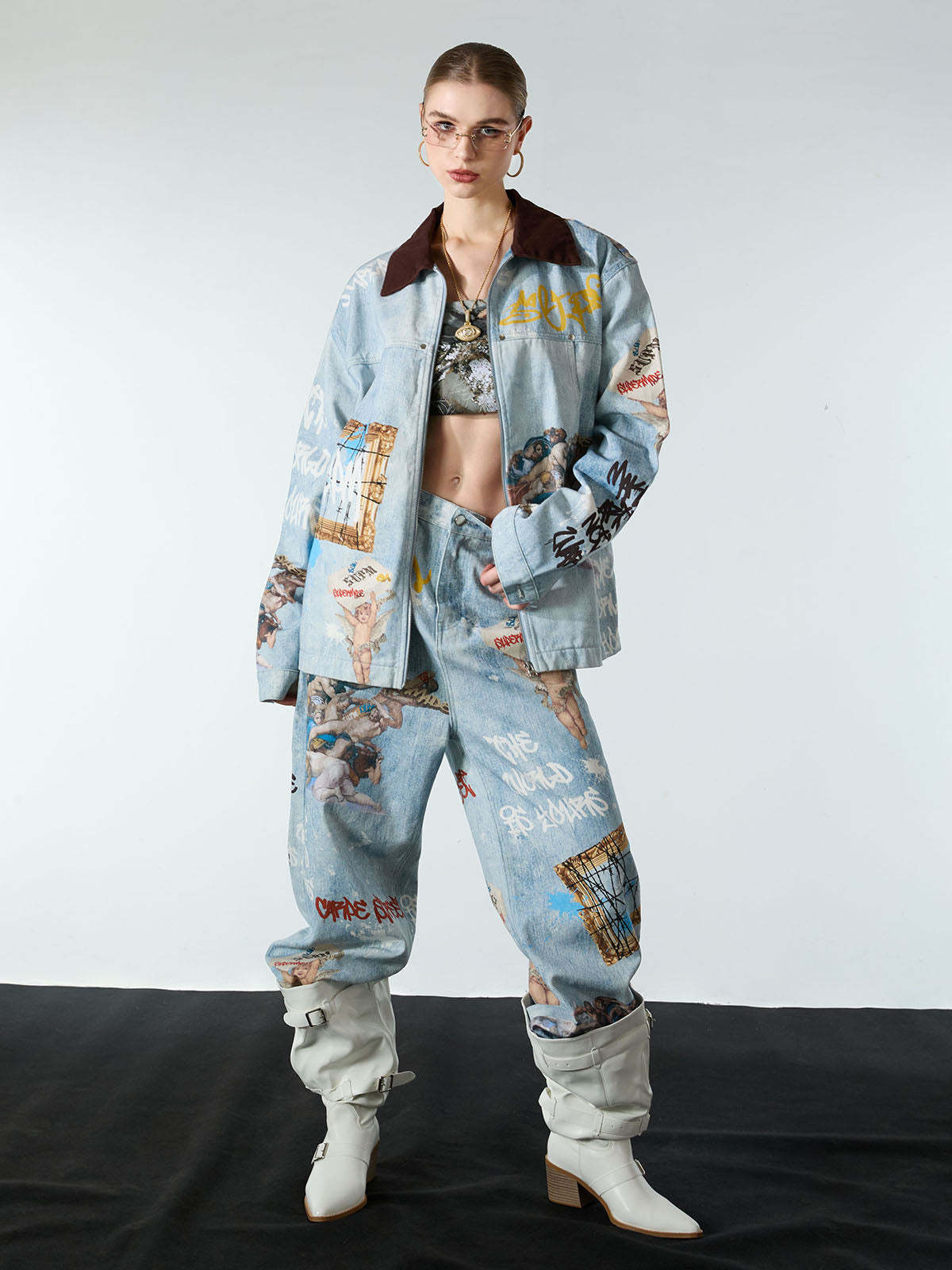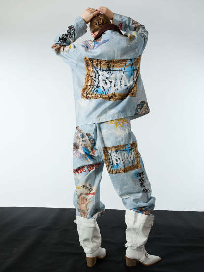 Artistic Patches Graphic Distressed Denim Jacket - 2573