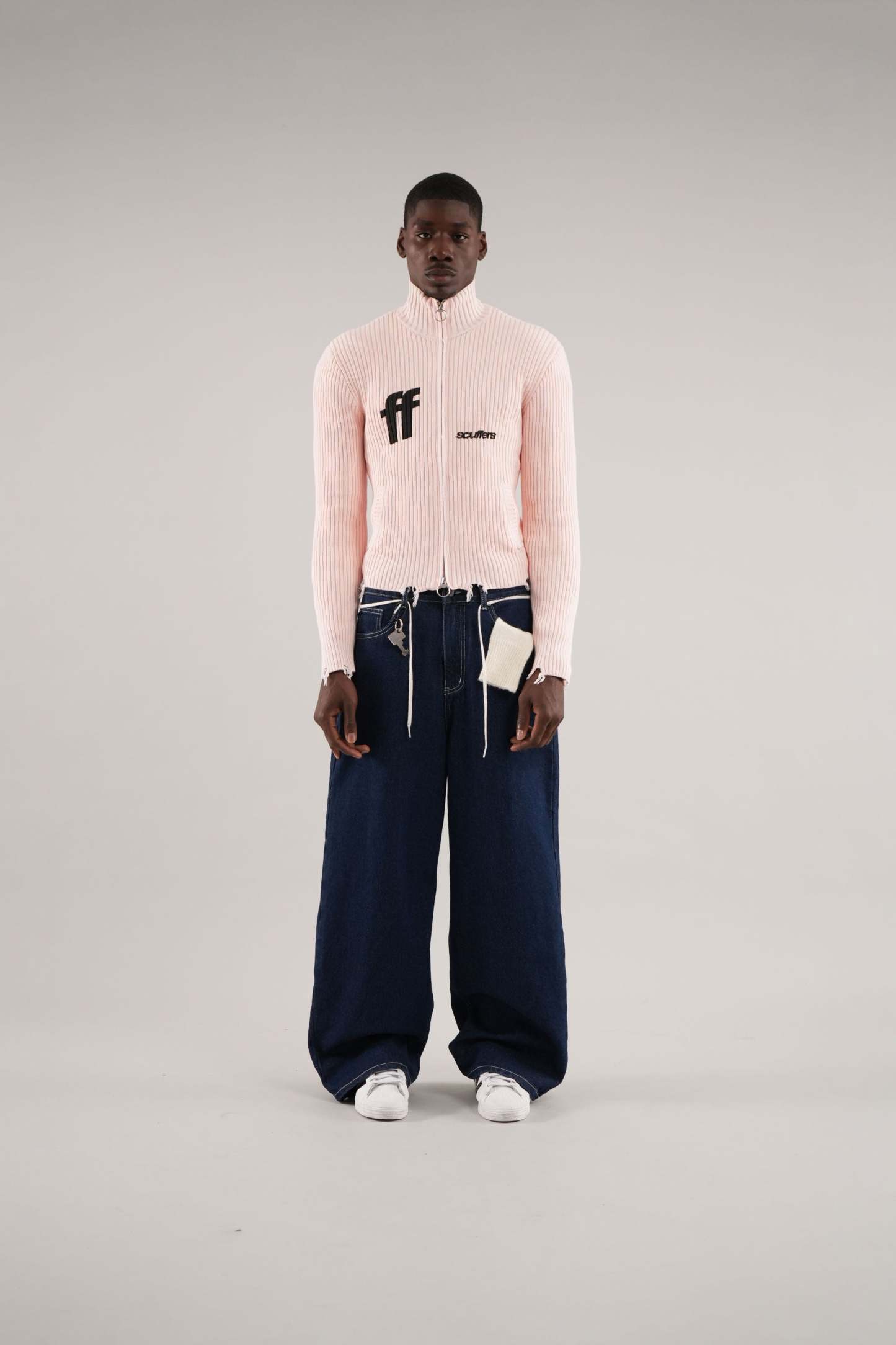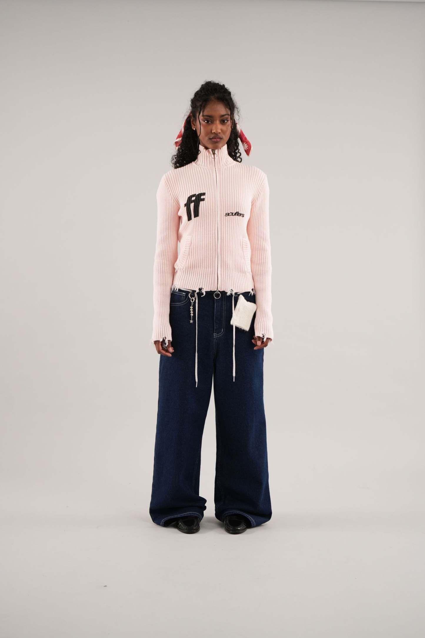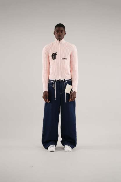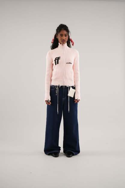 Ecru ribbed cardigan with a full zip-up front, featuring a unique ring puller for added style. The front displays bold black "ff" and Scuffers logos, bringing contrast to the soft color. Subtle distressed detailing at the hem adds a trendy touch, while two front pockets enhance functionality. A cozy and stylish choice for layering.