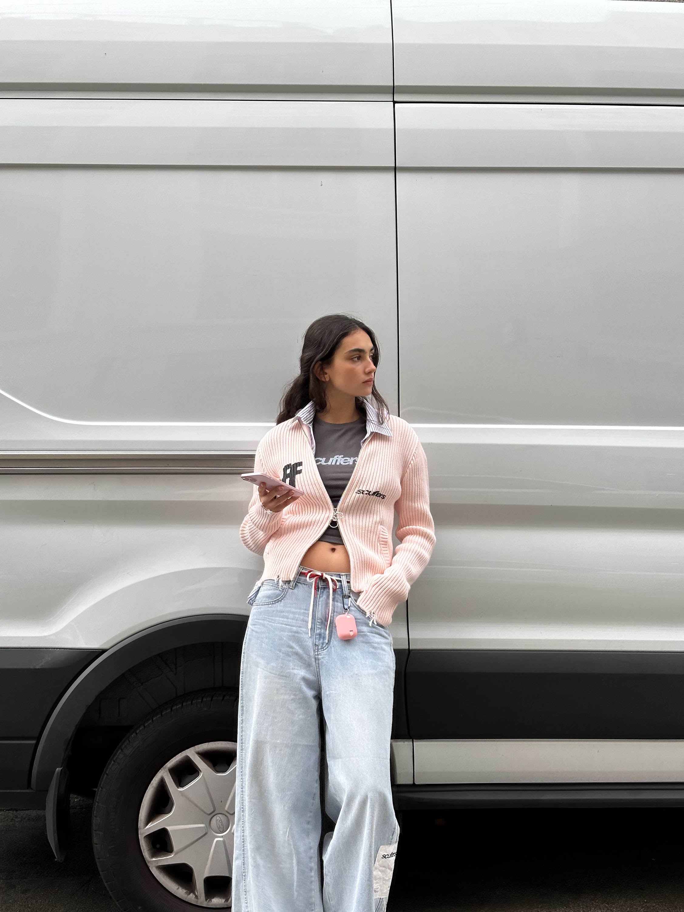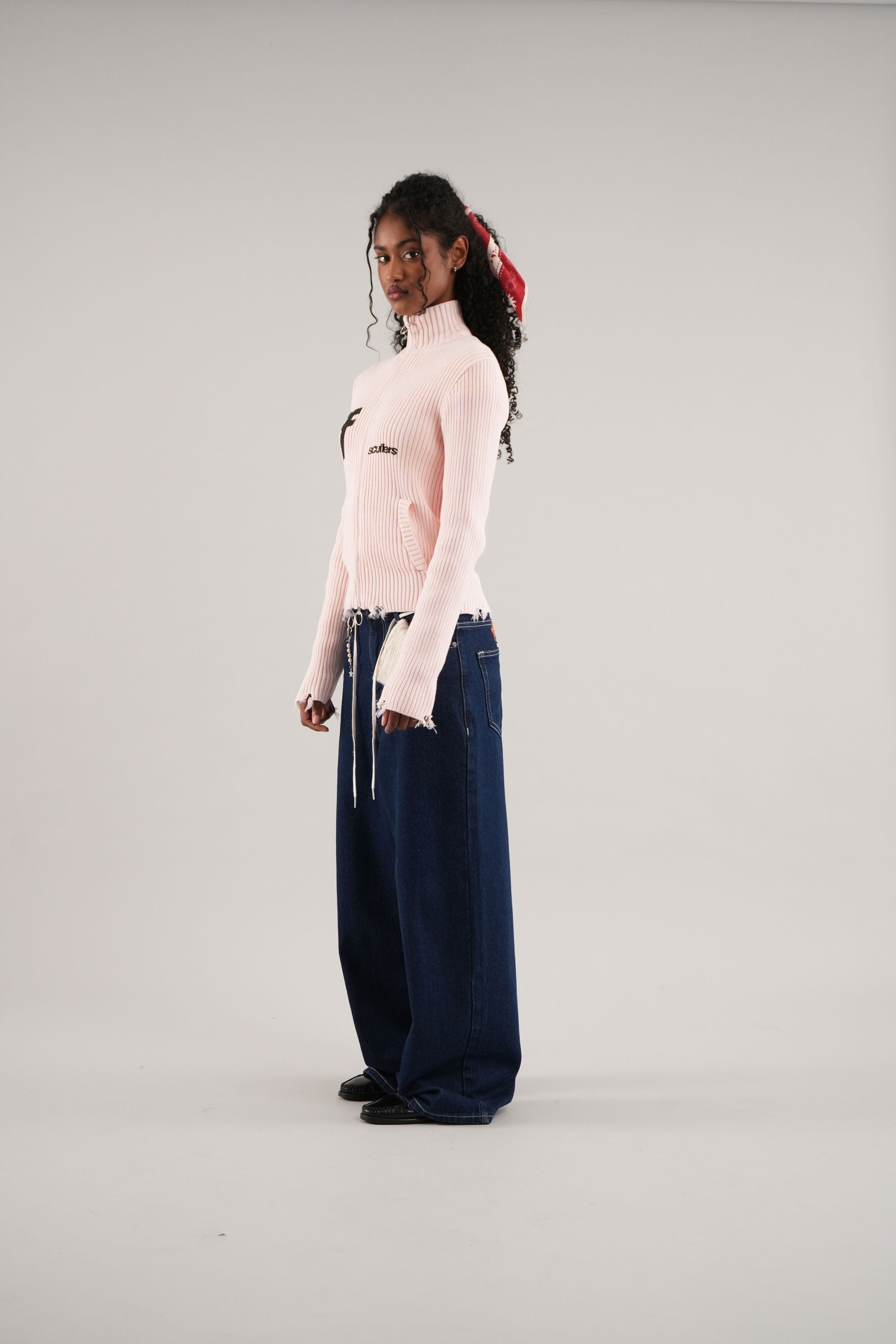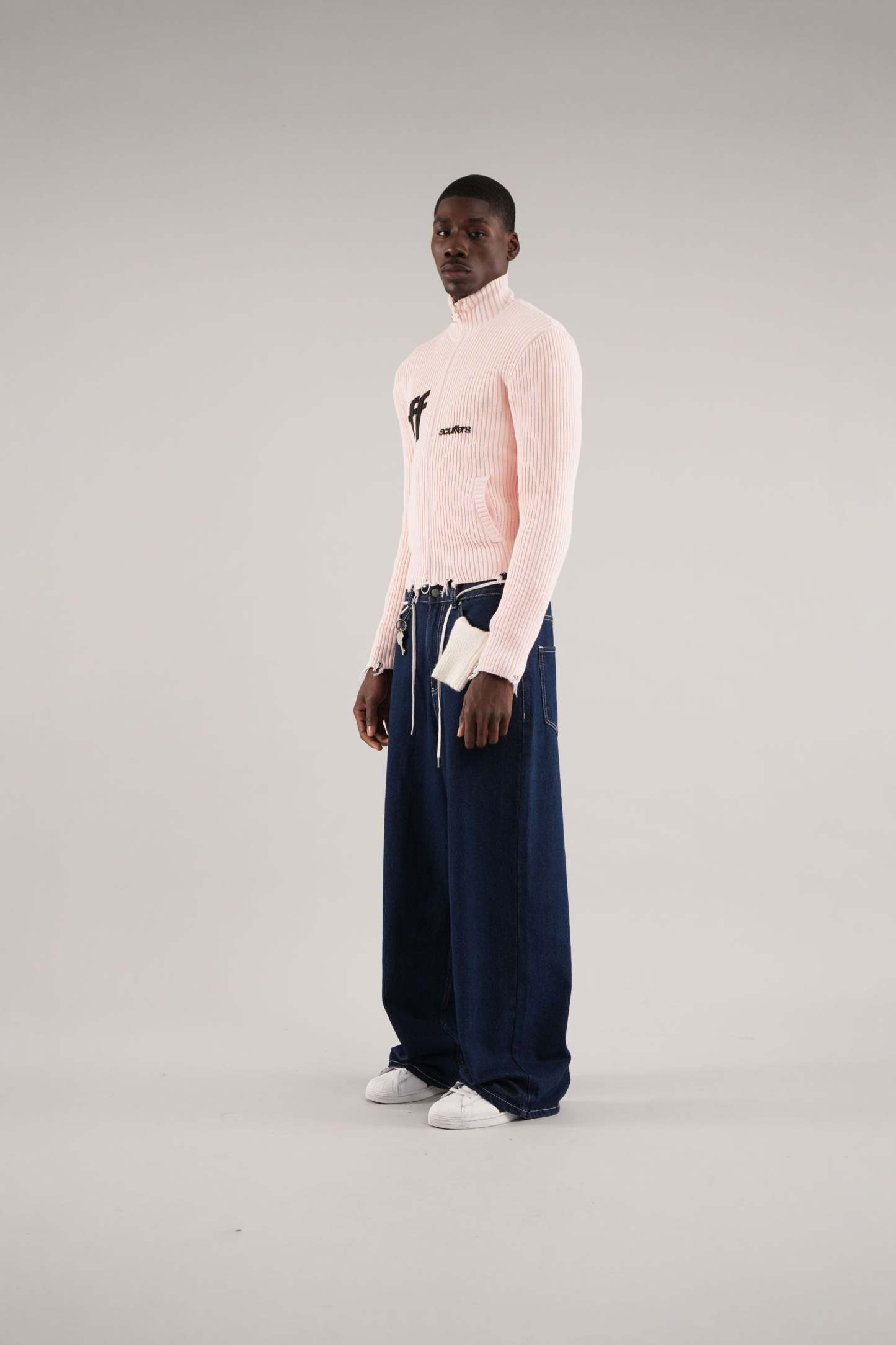Ecru ribbed cardigan with a full zip-up front, featuring a unique ring puller for added style. The front displays bold black "ff" and Scuffers logos, bringing contrast to the soft color. Subtle distressed detailing at the hem adds a trendy touch, while two front pockets enhance functionality. A cozy and stylish choice for layering.