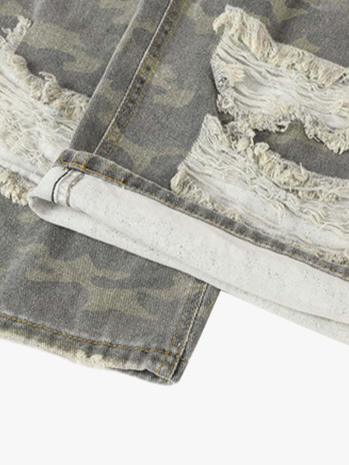 • Design Elements: Distressed details, camouflage paneling, wide-leg silhouette