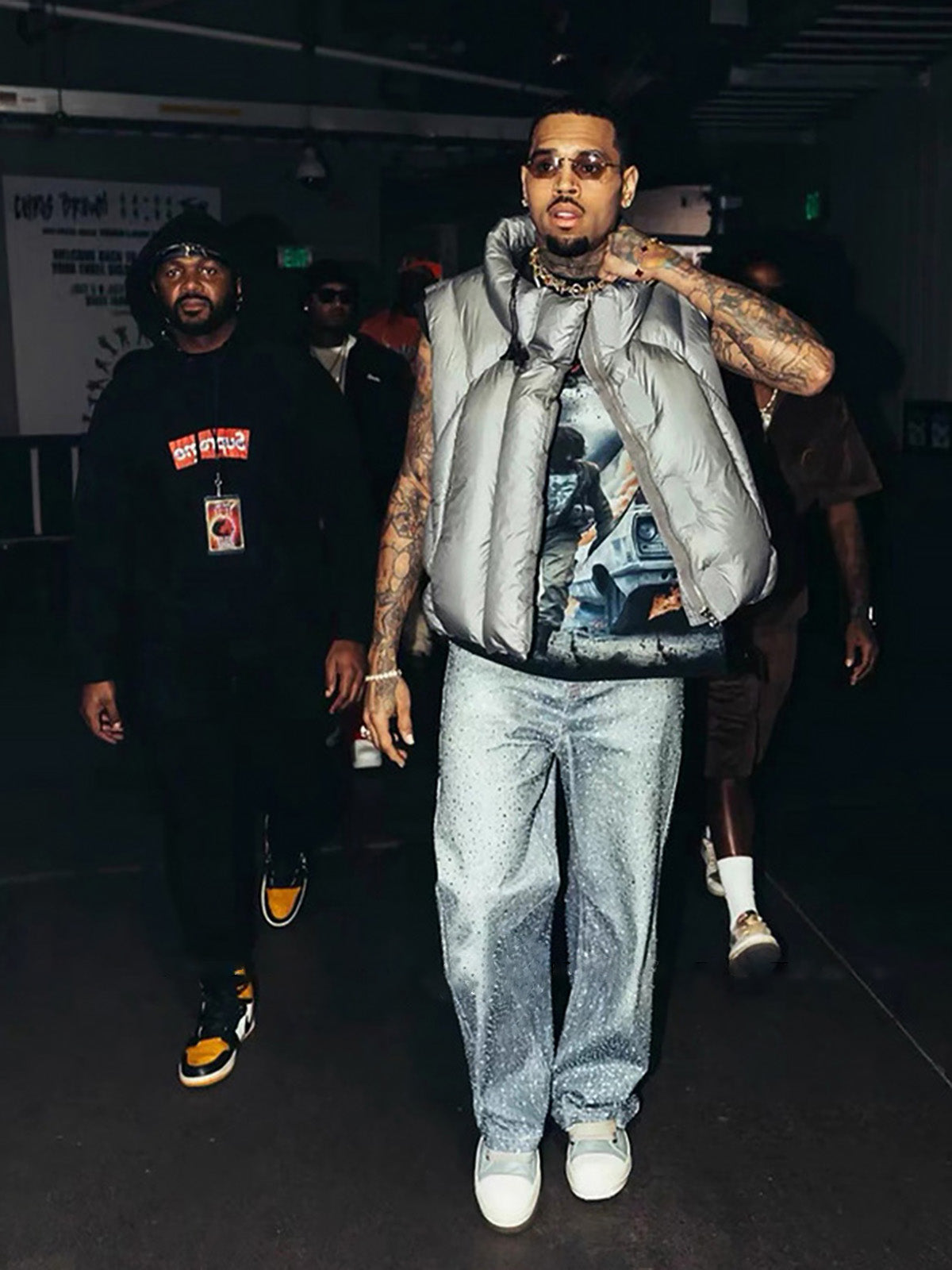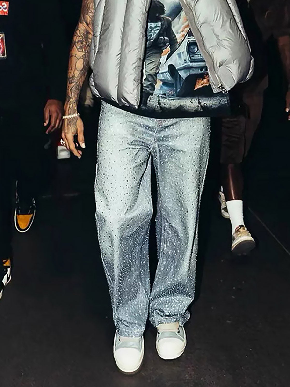 • Design Elements: All-over sequin embellishment on pants, graphic print tee, puffer jacket for layering