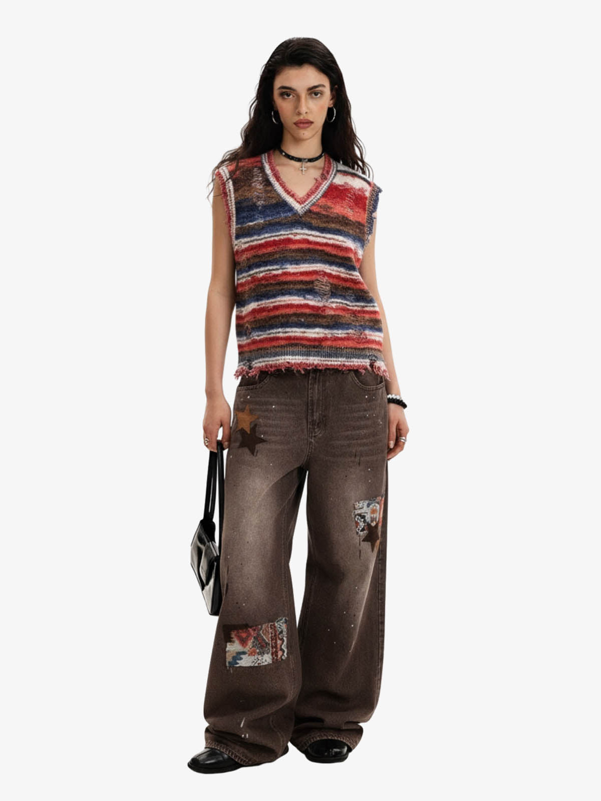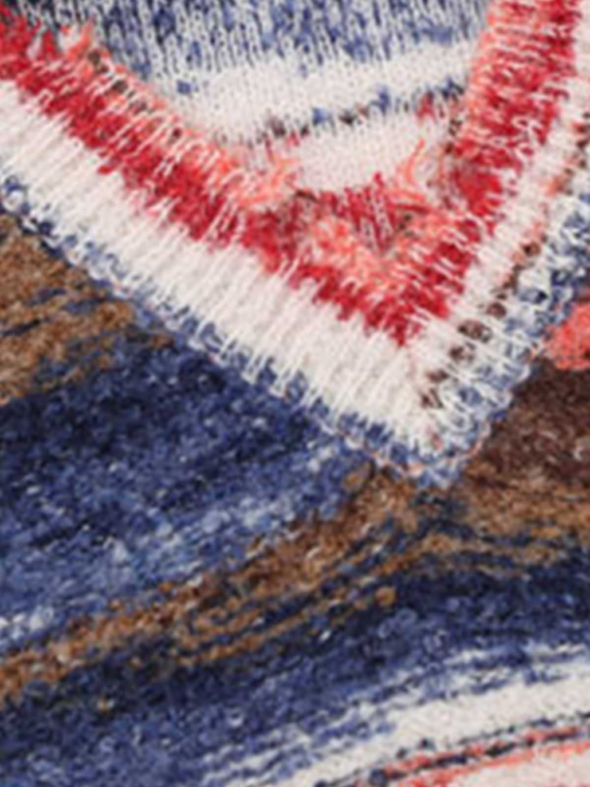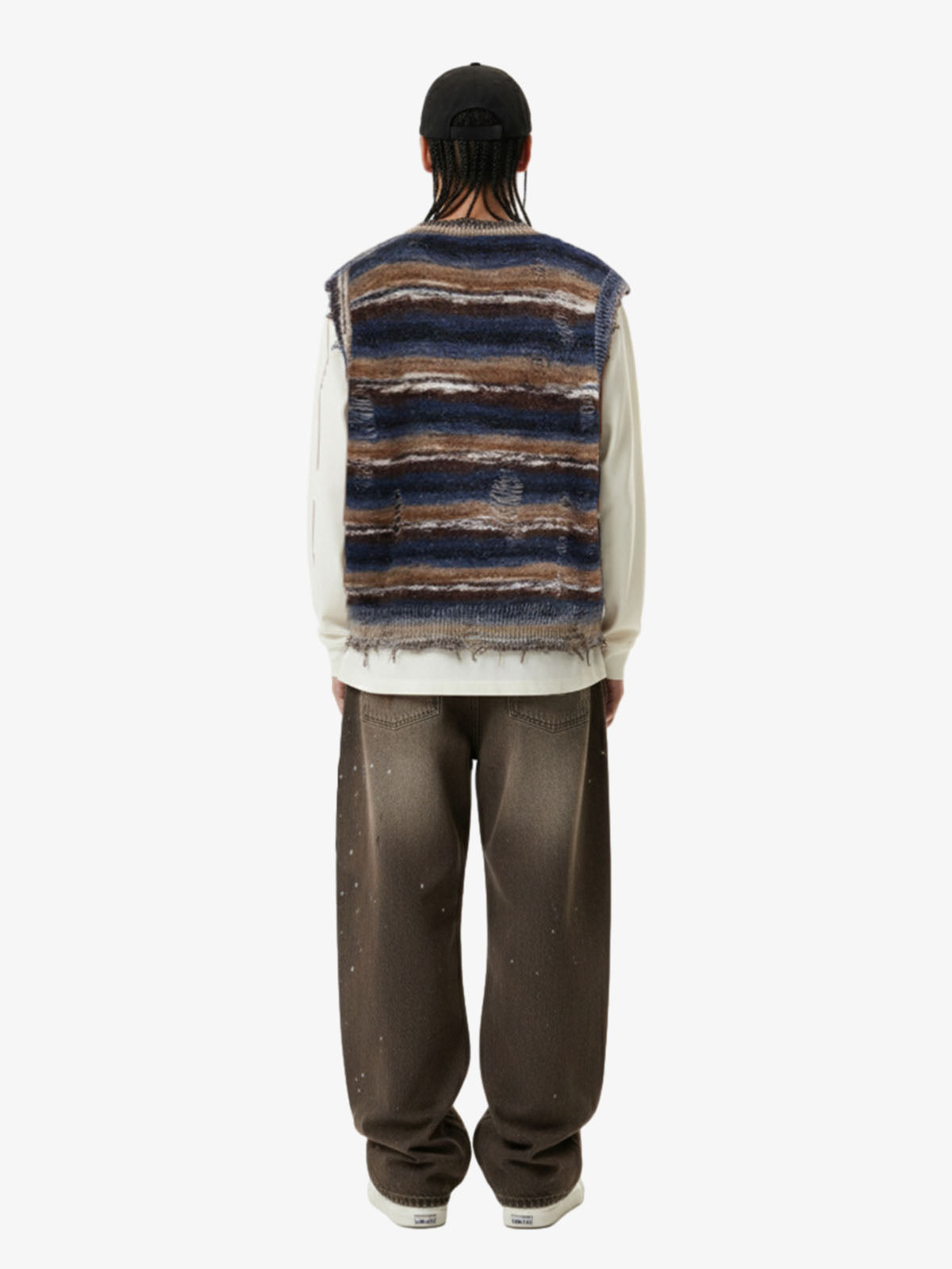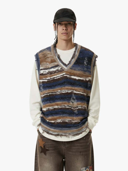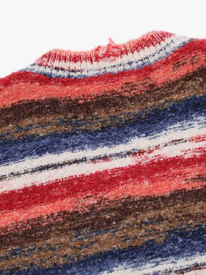 • Design Elements: Multicolor Striped Knit, Distressed Frayed Edges, Textured Yarn