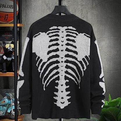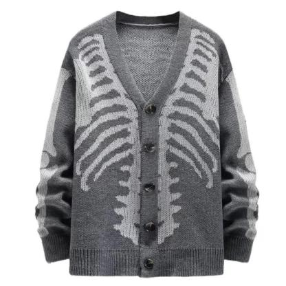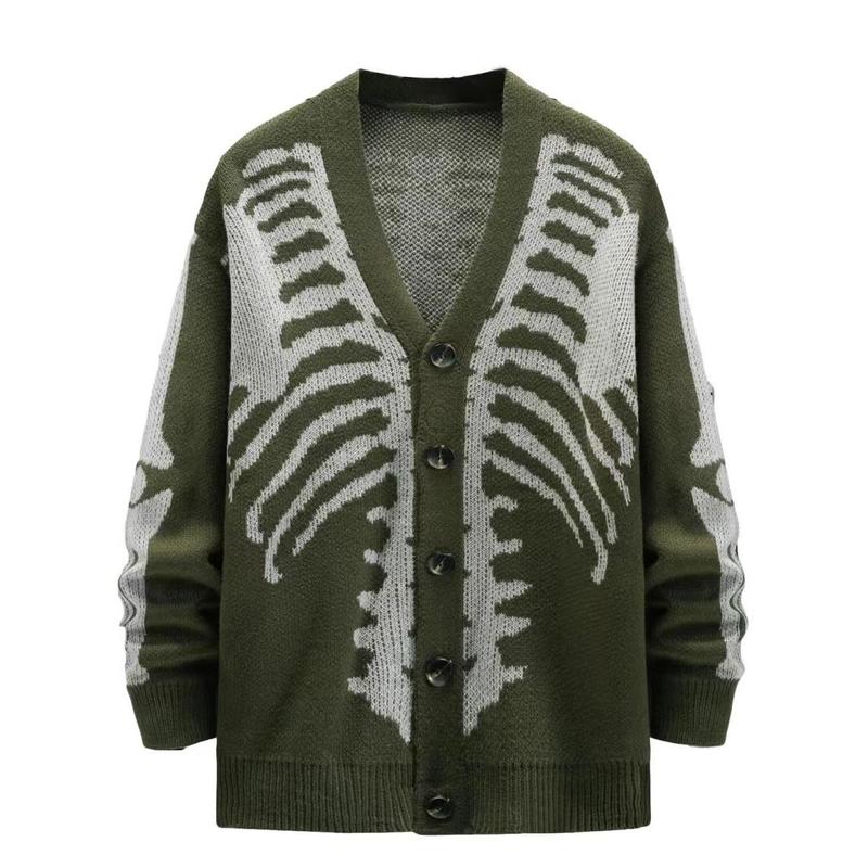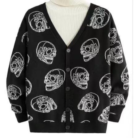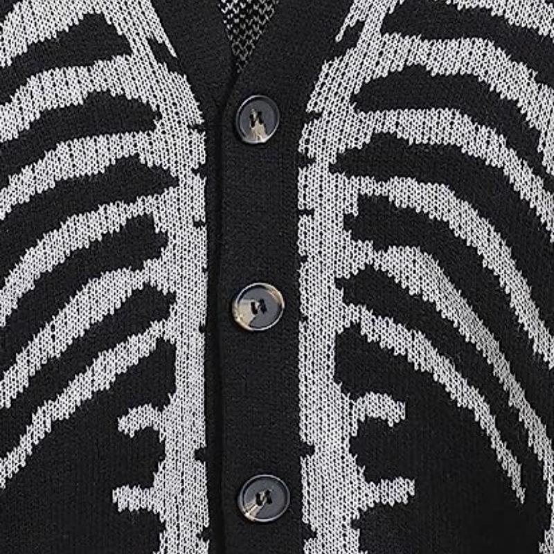Halloween Skull Jacquard Sweater Jacket for Men & Women - Black Long Sleeve V-Neck Knitwear Cardigan for Autumn Winter Casual Goth Style