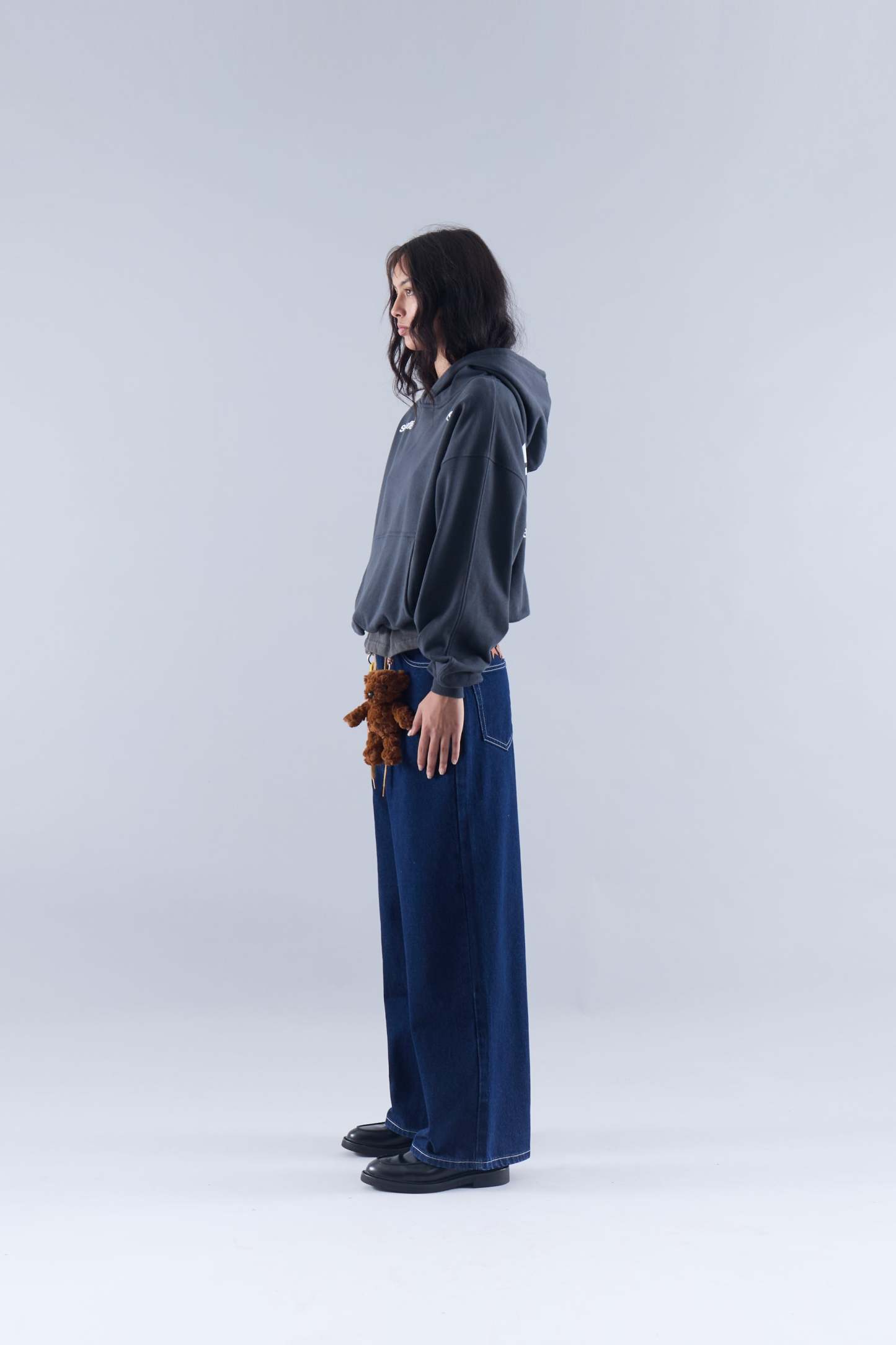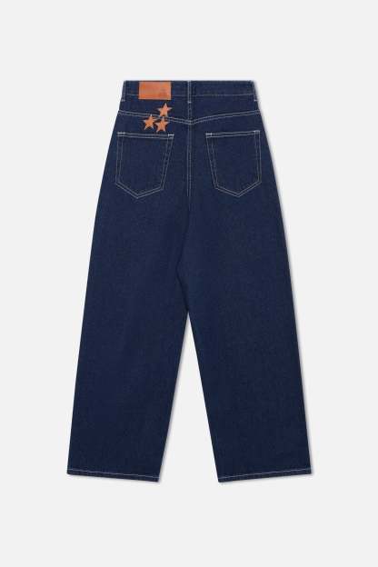 Oversized baggy style denim deep blue jeans, with standard waistband and a distressed effect. Five-pocket traditional jeans with our 'Worldwide' stars stitched on the upper left back in brown. Zipper closure and labelled button. Belt loops at waistband with our 'Scuffers' branded brown tag.