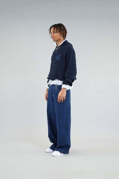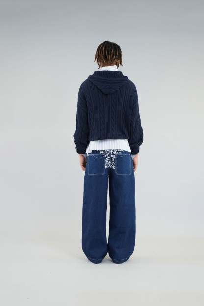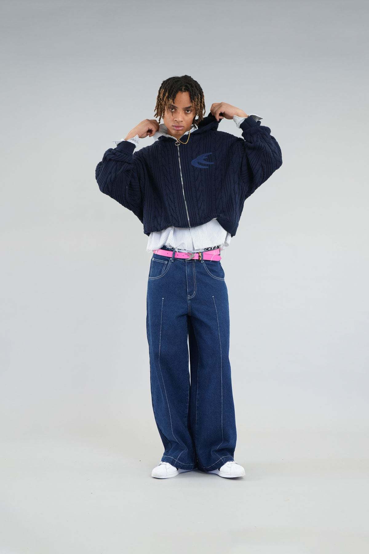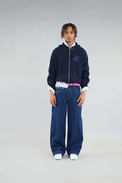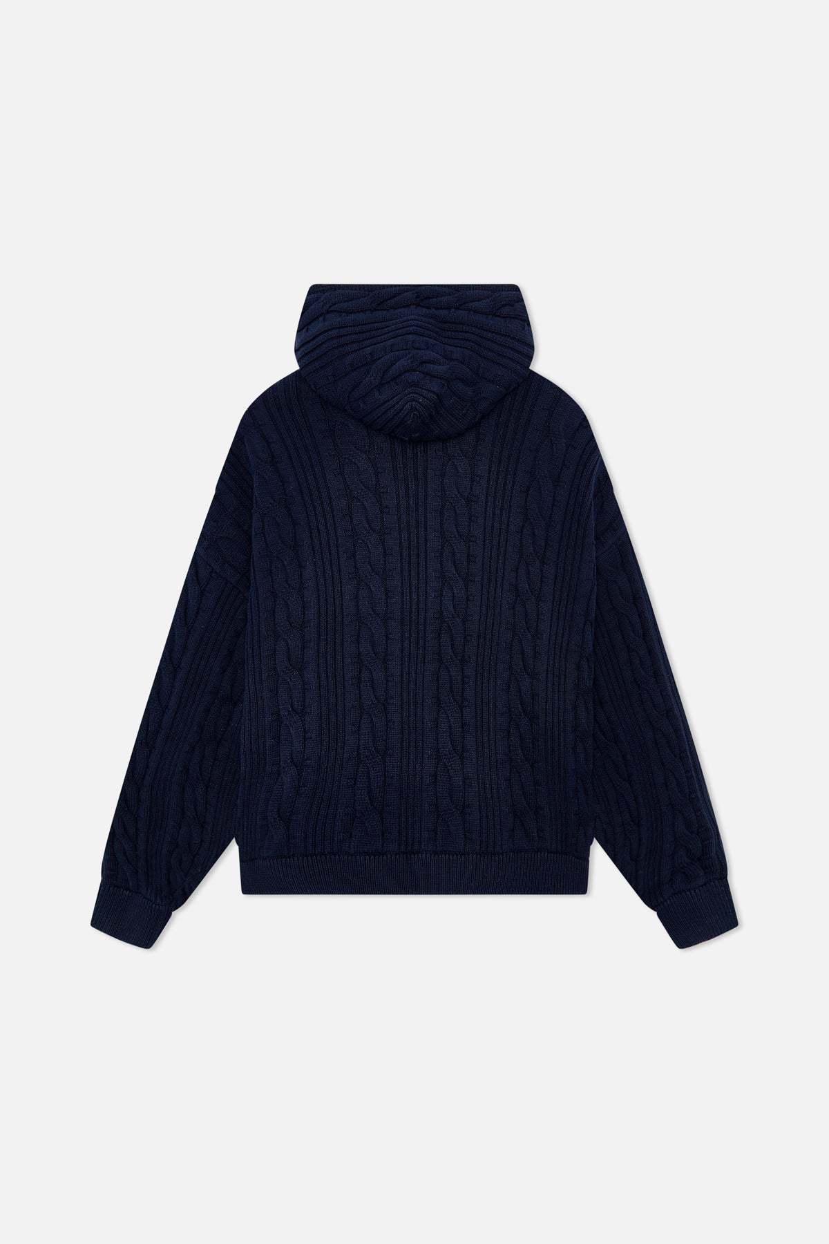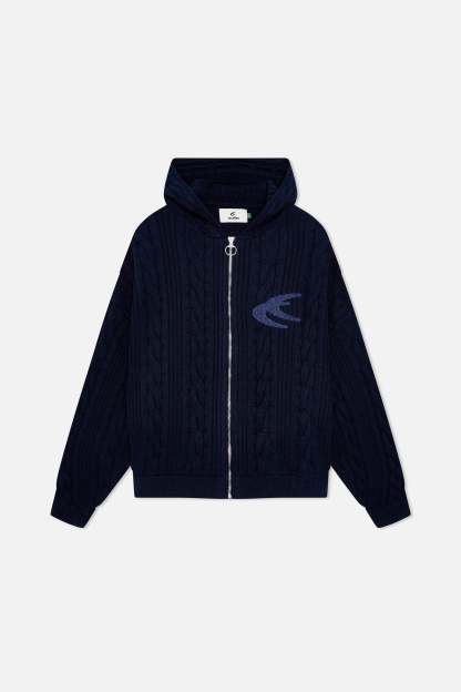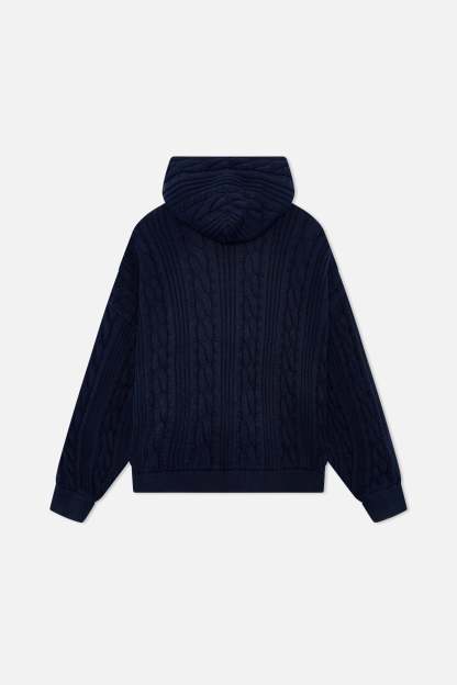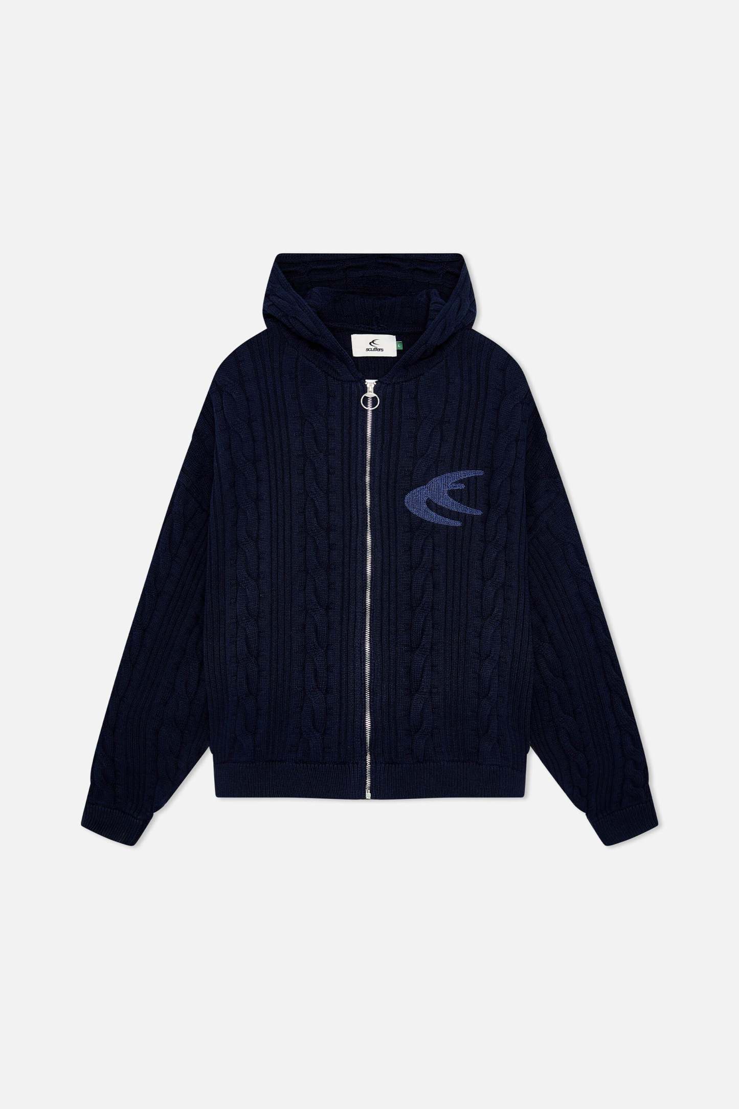 Navy zip-up jersey featuring a cable-knit pattern throughout. The front has a silver zipper and a light blue embroidered Scuffers logo on the chest. The hood is also knit in the same pattern, and the garment has a relaxed fit with ribbed cuffs and hem.