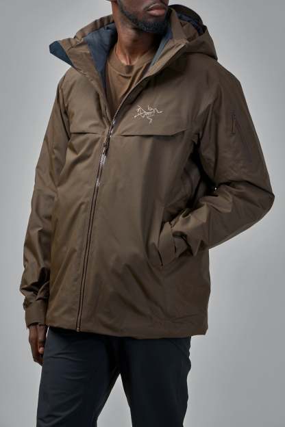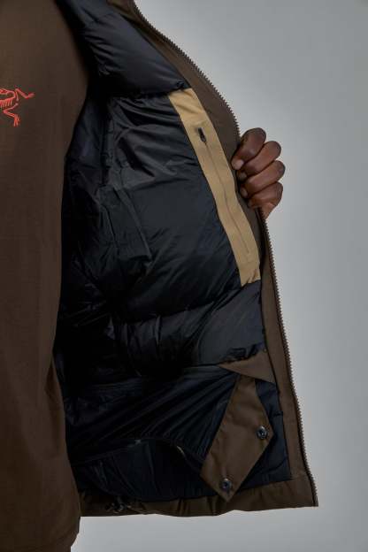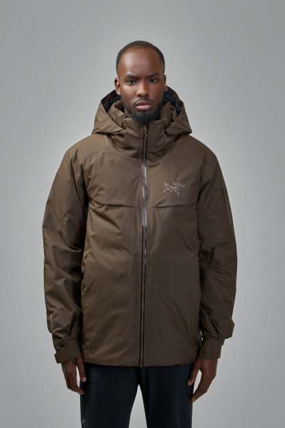 ARC'TERYX Macai Down jacket features a full front zipper closure and an attached hood. The chest is adorned with a subtle embroidered logo, offering a blend of utility and branding. This jacket is designed for comfort and outdoor readiness.