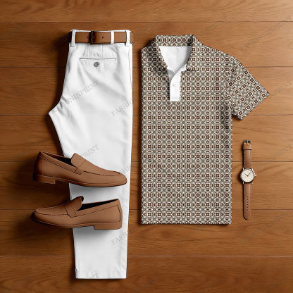 Men's Casual Brown & White Color Matching Retro Style Checkered Printed Short Sleeved Polo Shirt & Trousers Two-Piece Set
