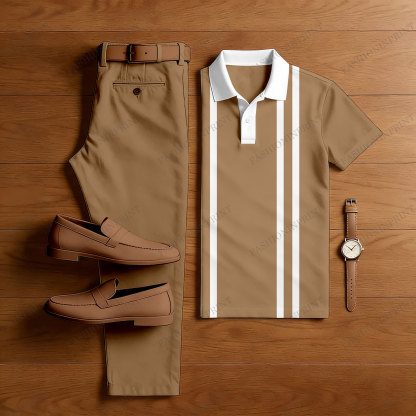 Men's Casual Brown & White Color Matching Striped Printed Short Sleeved Polo Shirt & Trousers Two-Piece Set