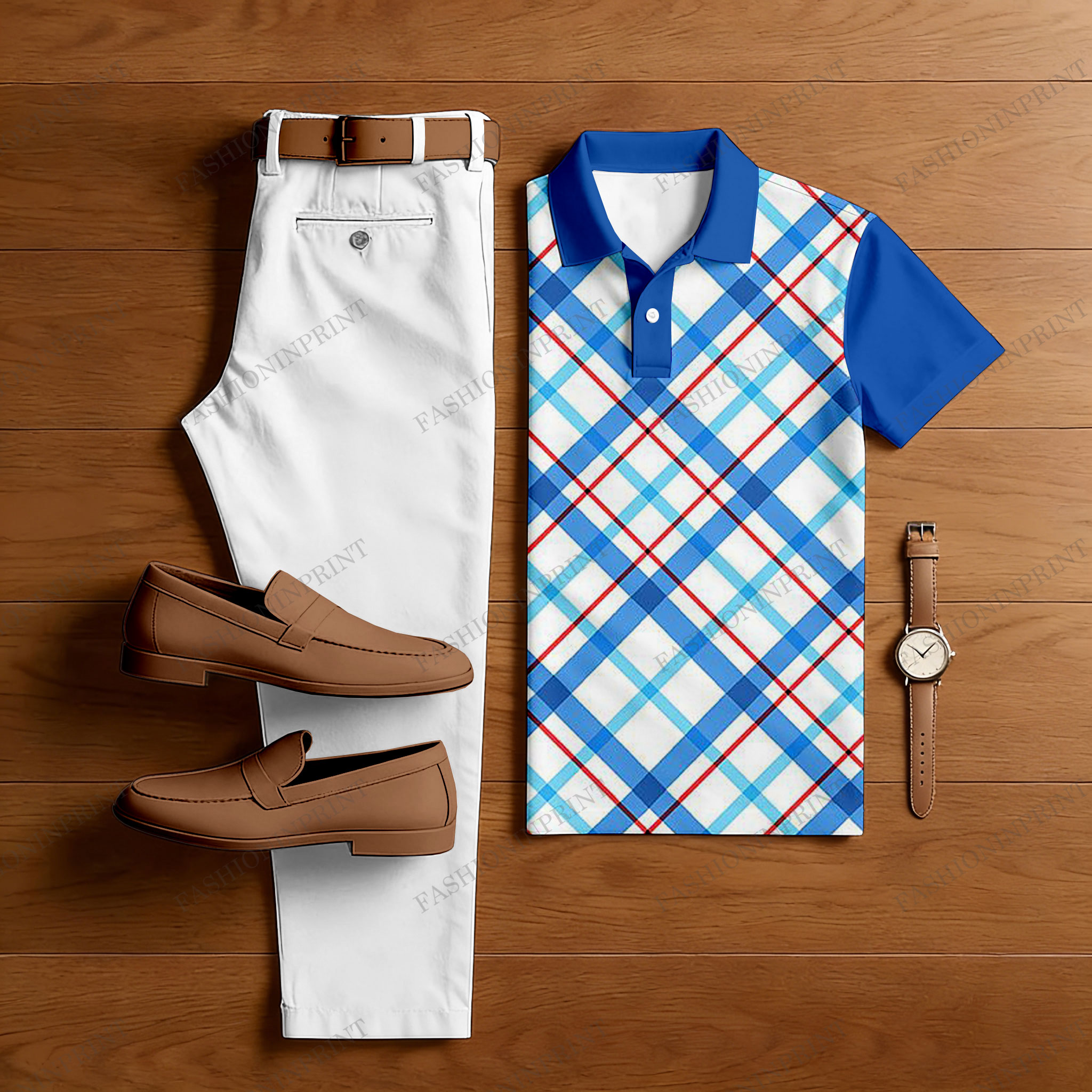 Men's Casual Royal Blue & White Color Matching Checkered Printed Short Sleeved Polo Shirt & Trousers Two-Piece Set