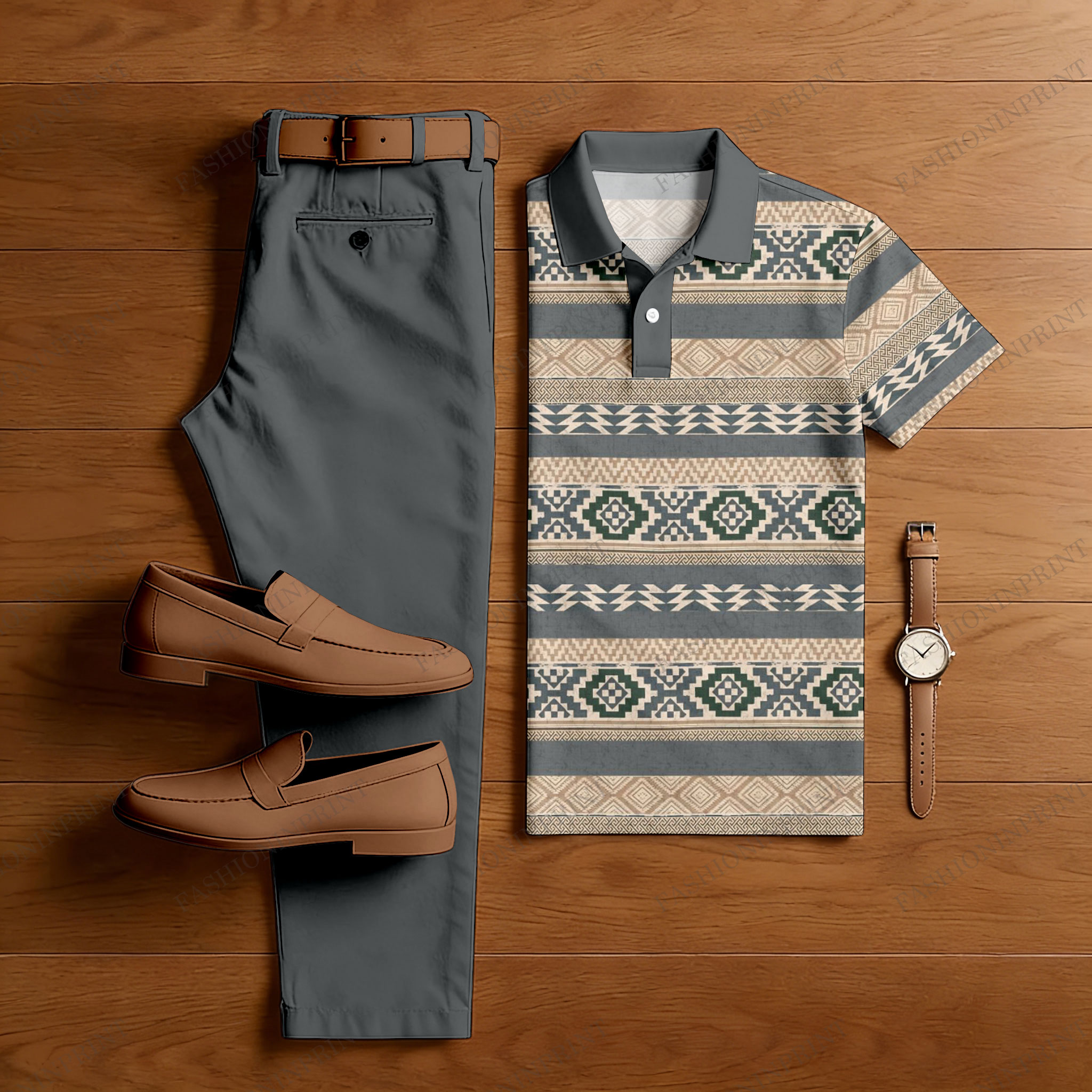 Men's Casual Gray & Apricot Color Matching Ethnic Style Printed Short Sleeved Polo Shirt & Trousers Two-Piece Set