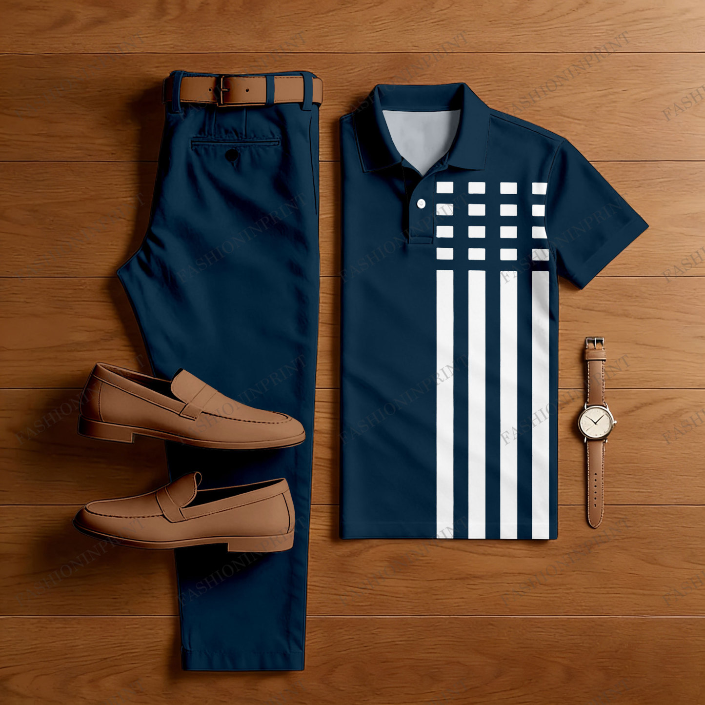 Men's Casual Dark Blue & White Color Matching Checkered Asymmetric Printed Short Sleeved Polo Shirt & Trousers Two-Piece Set