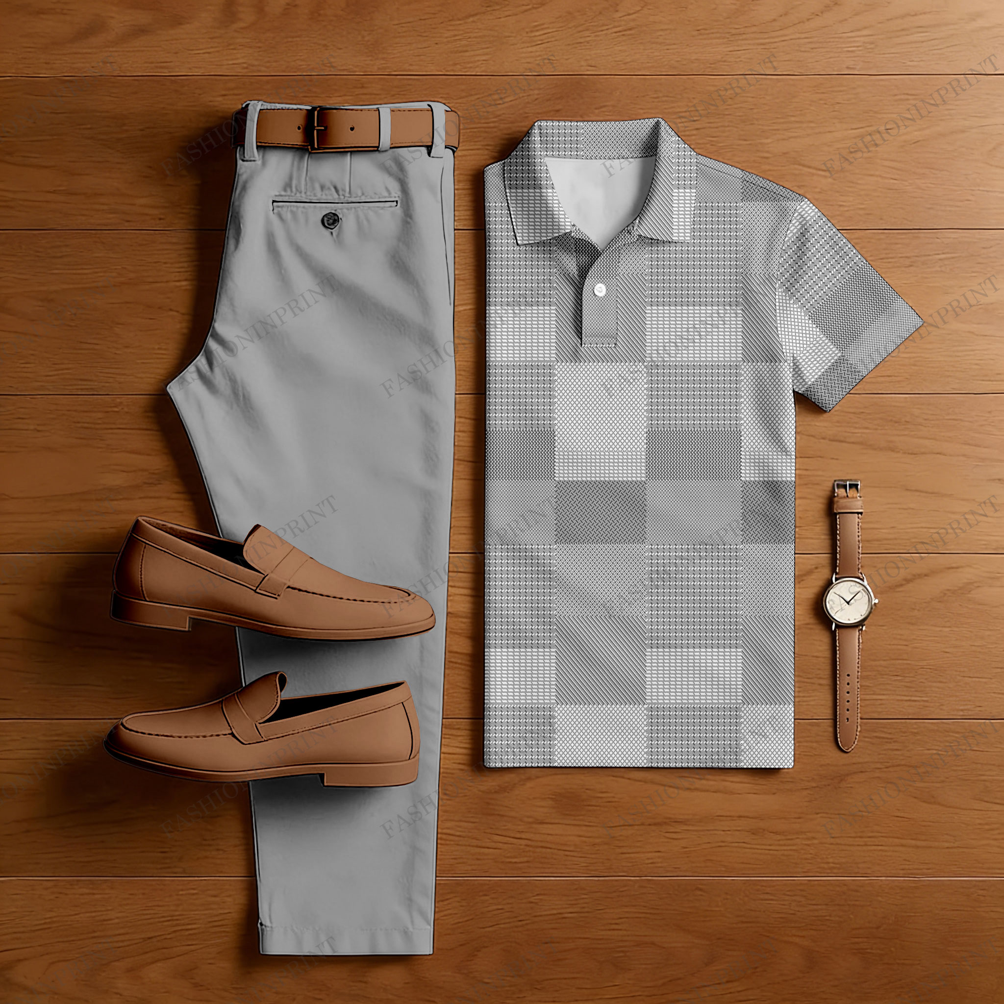 Men's Casual Gray Color Matching Checkered Printed Short Sleeved Polo Shirt & Trousers Two-Piece Set