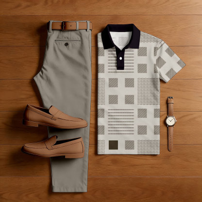Men's Casual Khaki & Black Color Matching Checkered Printed Short Sleeved Polo Shirt & Trousers Two-Piece Set