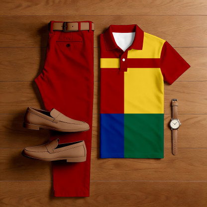 Men's Casual Red & Yellow & Green Color Matching Geometric Printed Short Sleeved Polo Shirt & Trousers Two-Piece Set